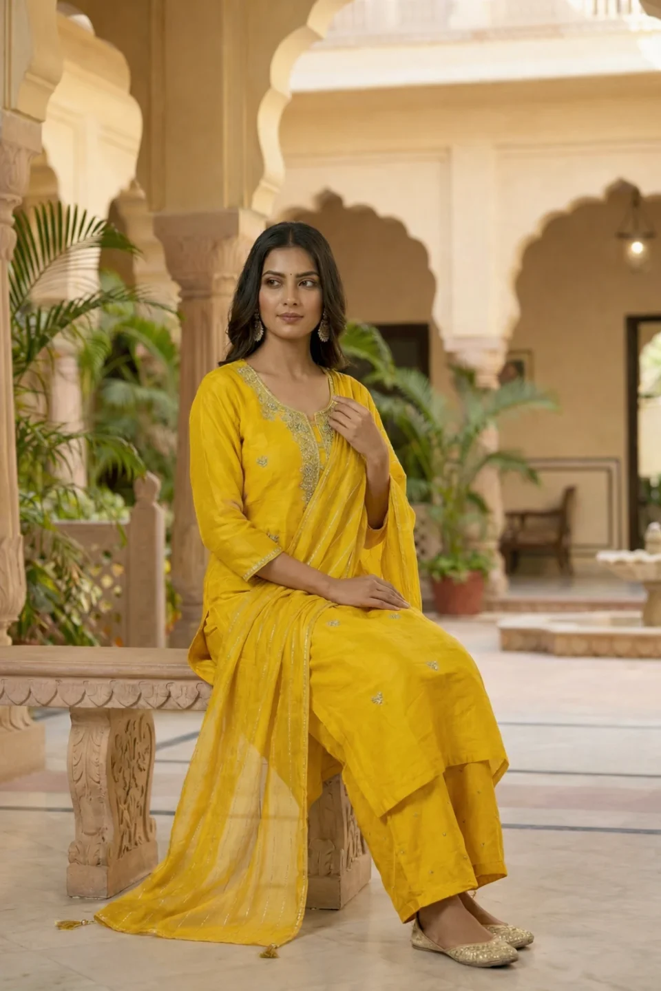 Mustard Yellow Hand-Embroidered Kurta Set with Wide-Leg Palazzos and Dupatta