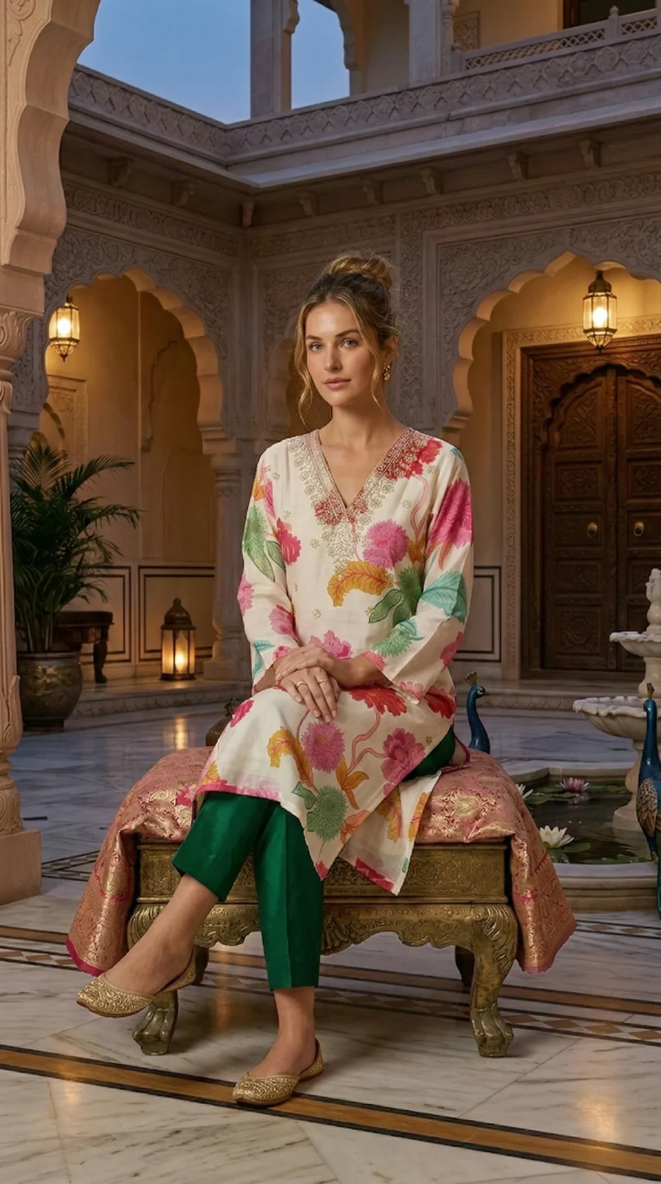 Off-Cream Multi-Color Floral Embroidered Kurti