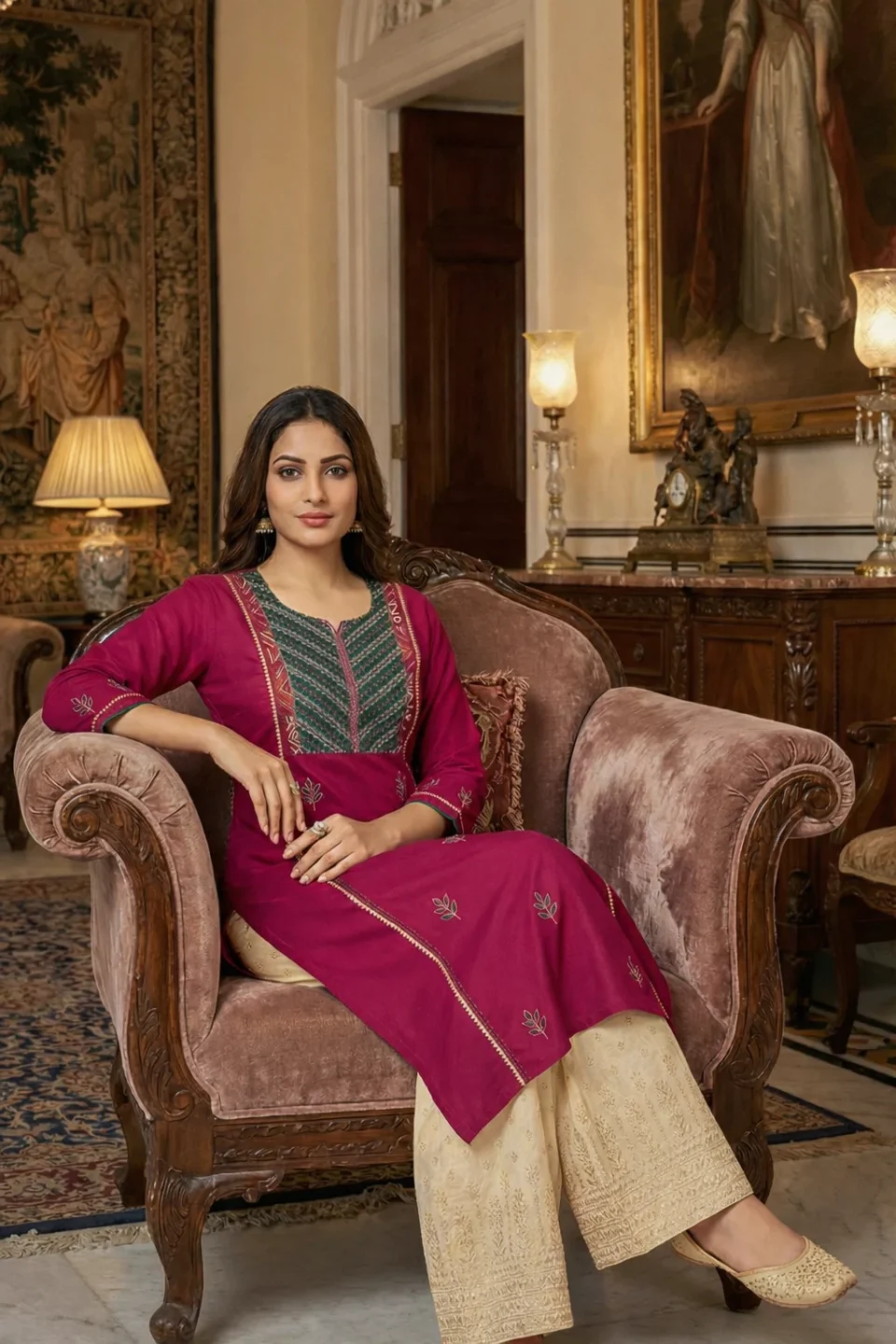 Rani Pink Embroidered Straight Kurti