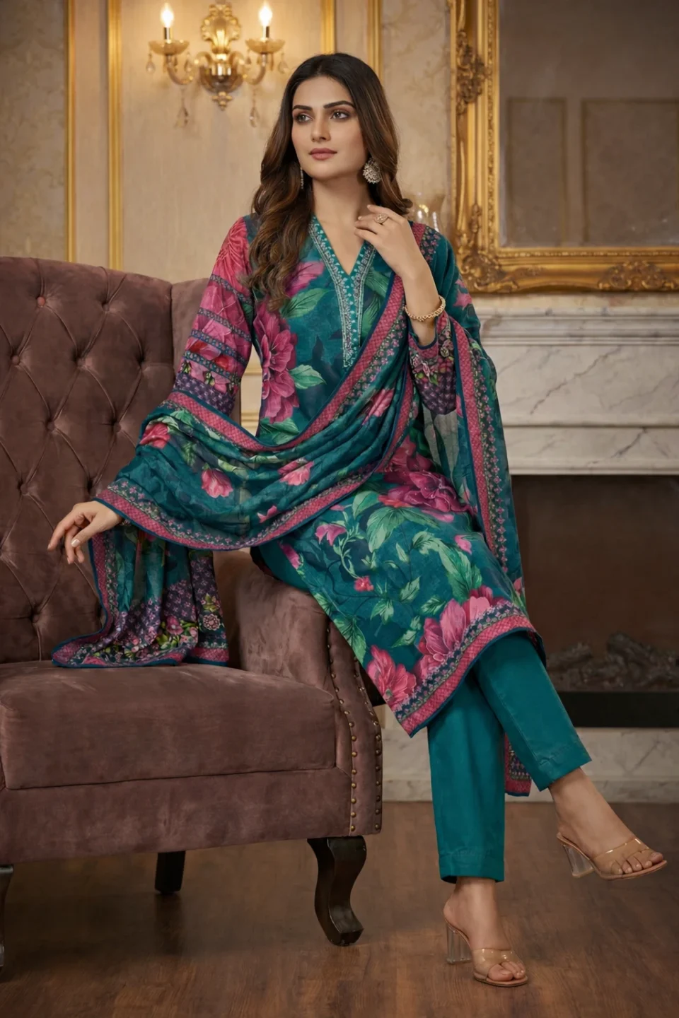 Premium Teal Floral Printed Kurta Pant Set with Dupatta