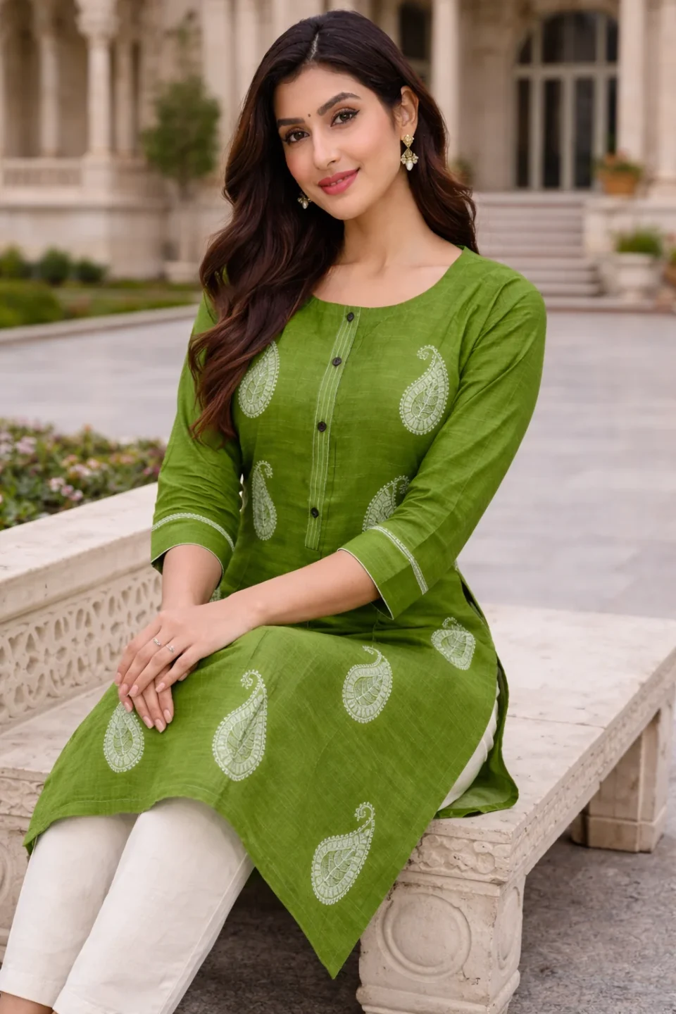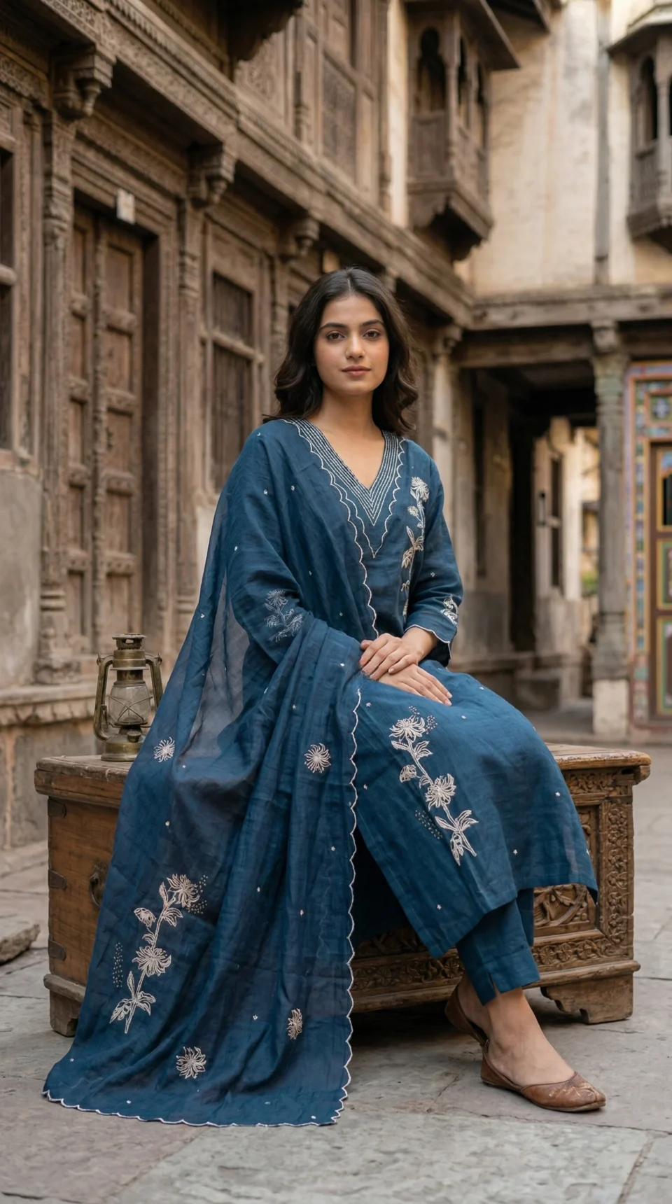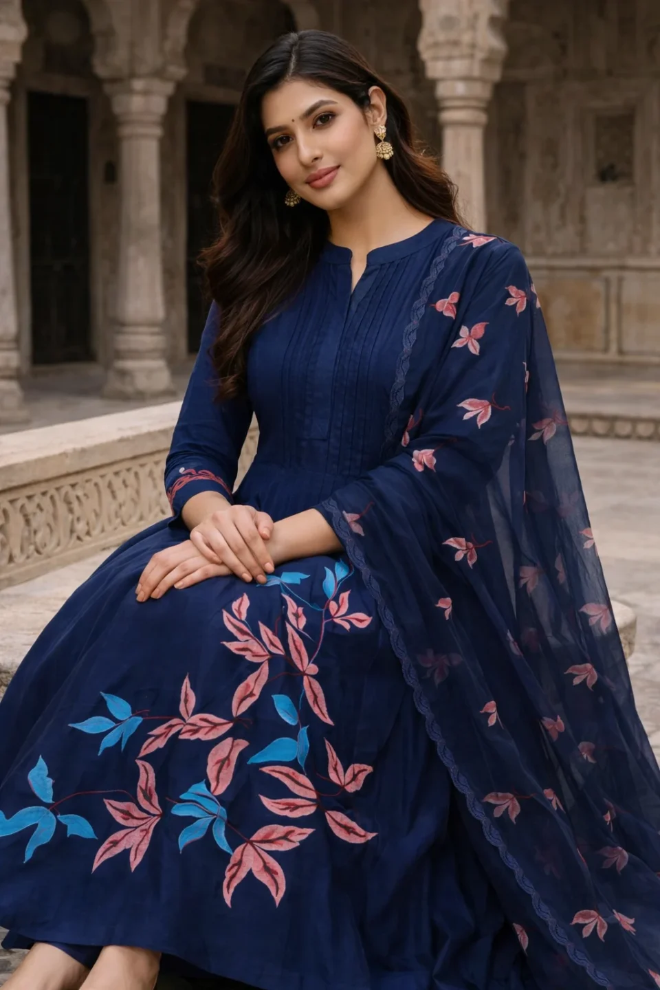 Navy Blue Floral Embroidered Long Kurti Set with Dupatta