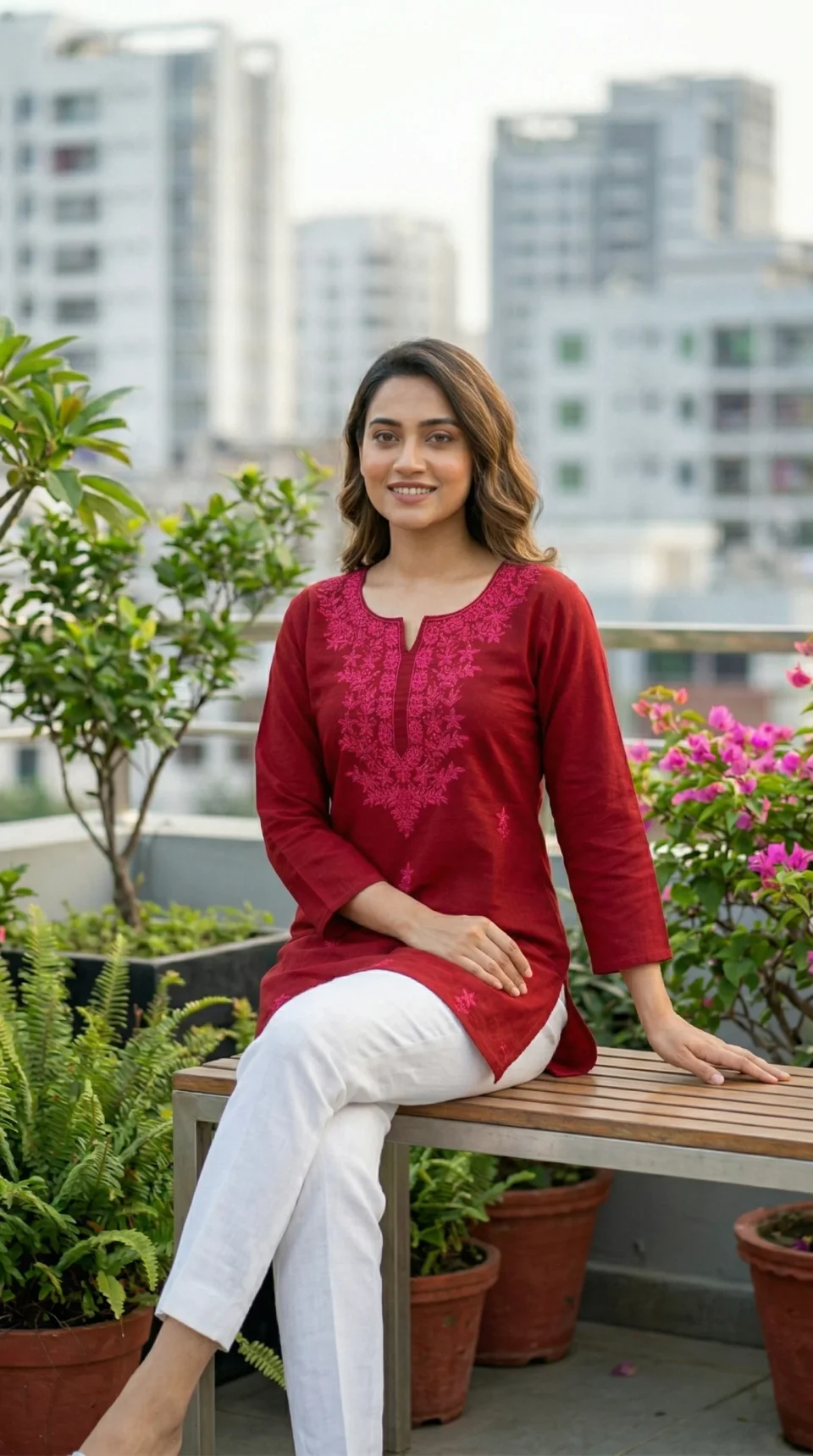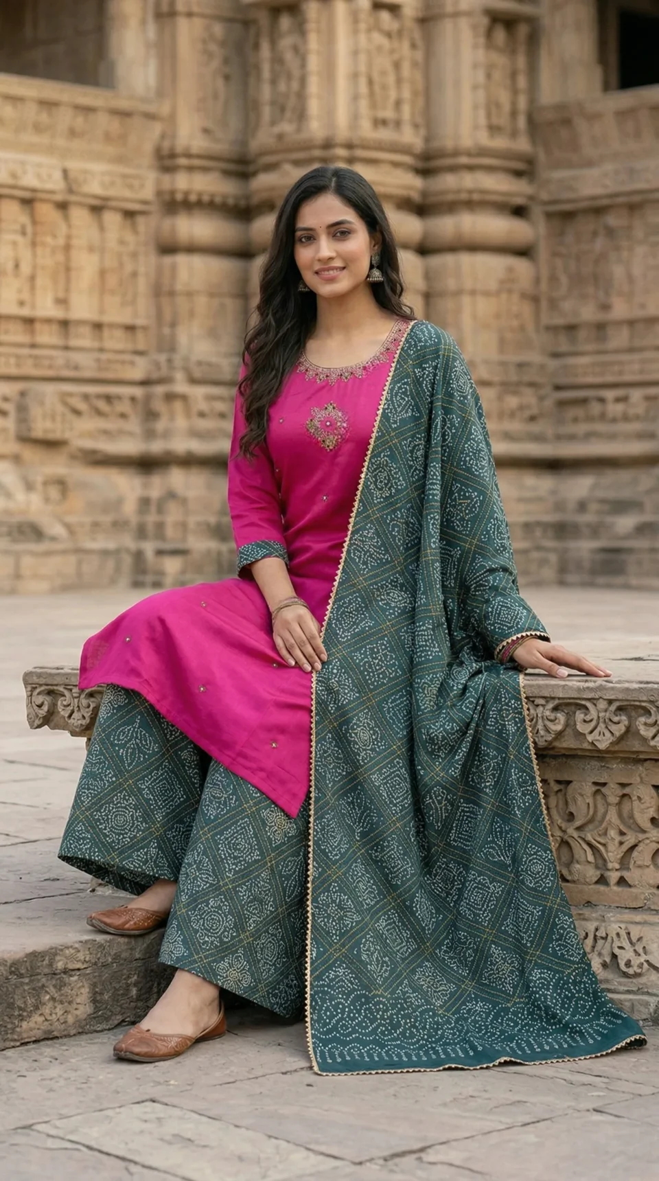 Rani Pink Embroidered Long Kurti with Printed Dupatta & Palazzo