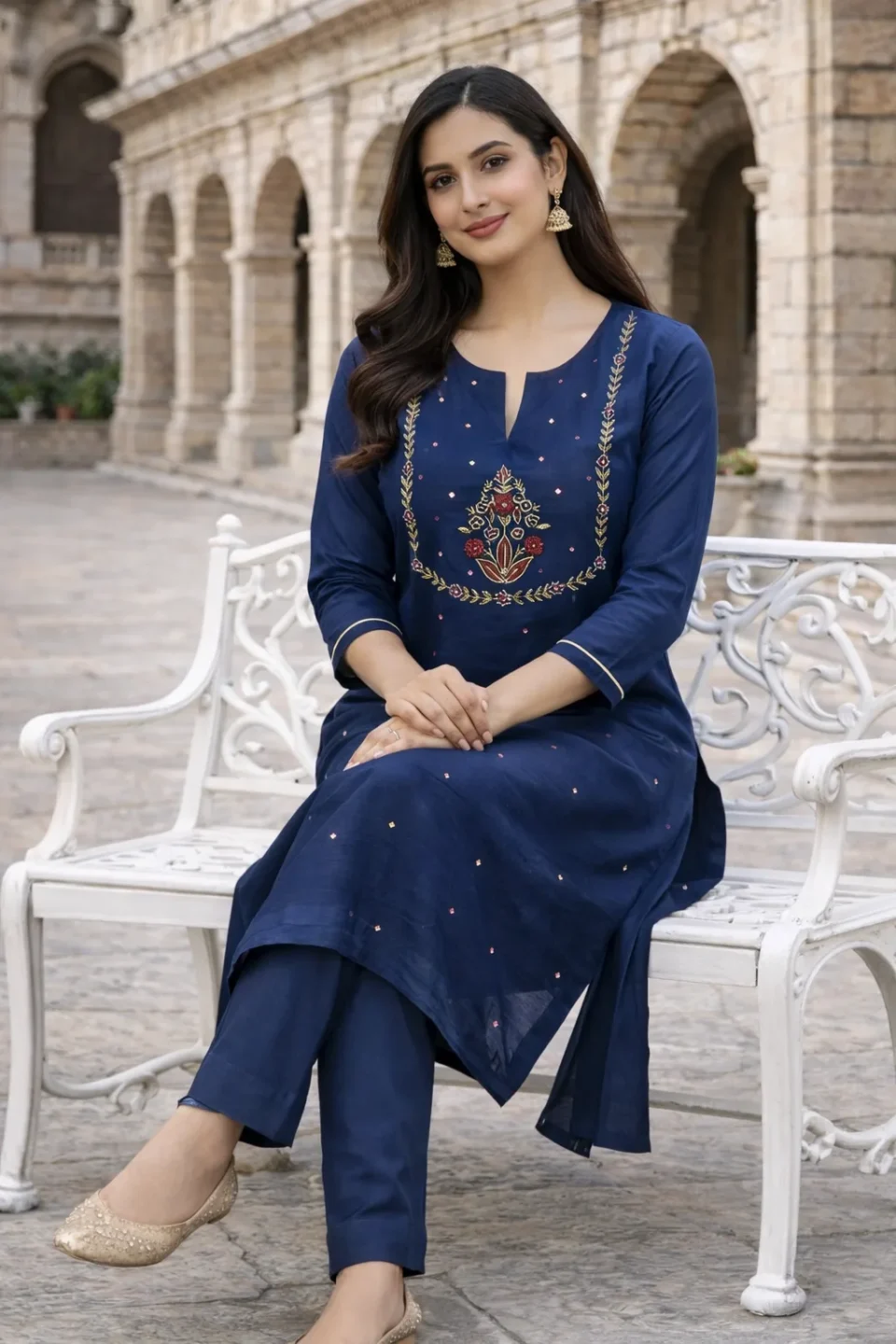 Lotus Bloom Embroidered Cotton Silk Short Kurta Set