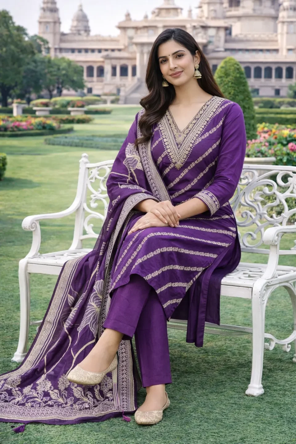 Royal Purple Embroidered Kurti Set with Floral Dupatta