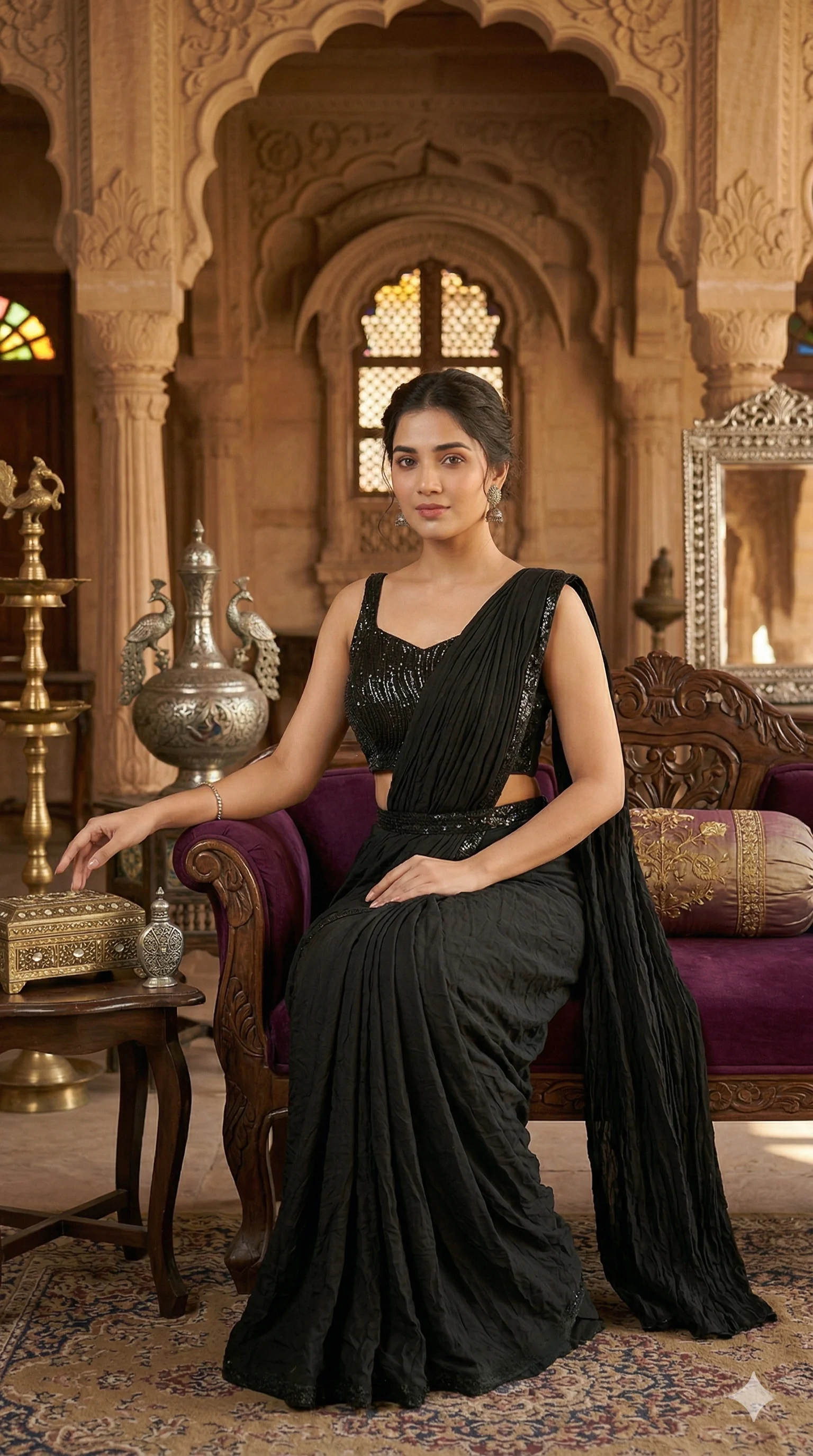 Stylish black ready-made saree featuring a shimmering sequin blouse and sleek draped design, perfect for party and evening wear.