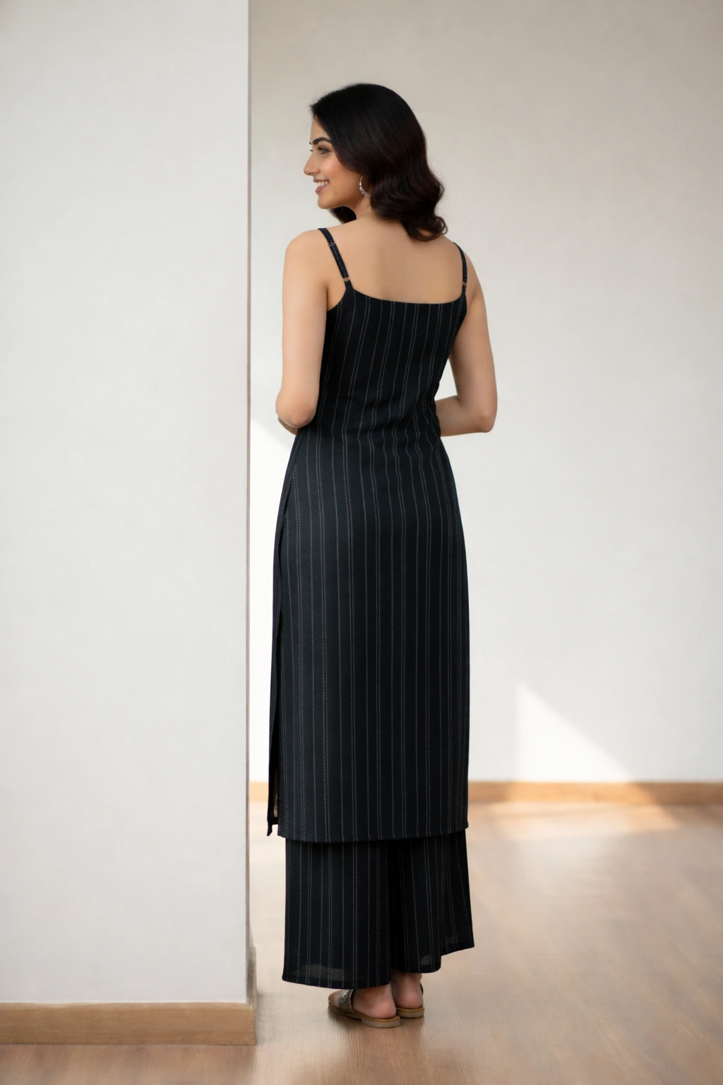Stylish black sleeveless straight kurti set featuring fine vertical pinstripe detailing, paired with matching black palazzo pants for a chic and modern ethnic look.