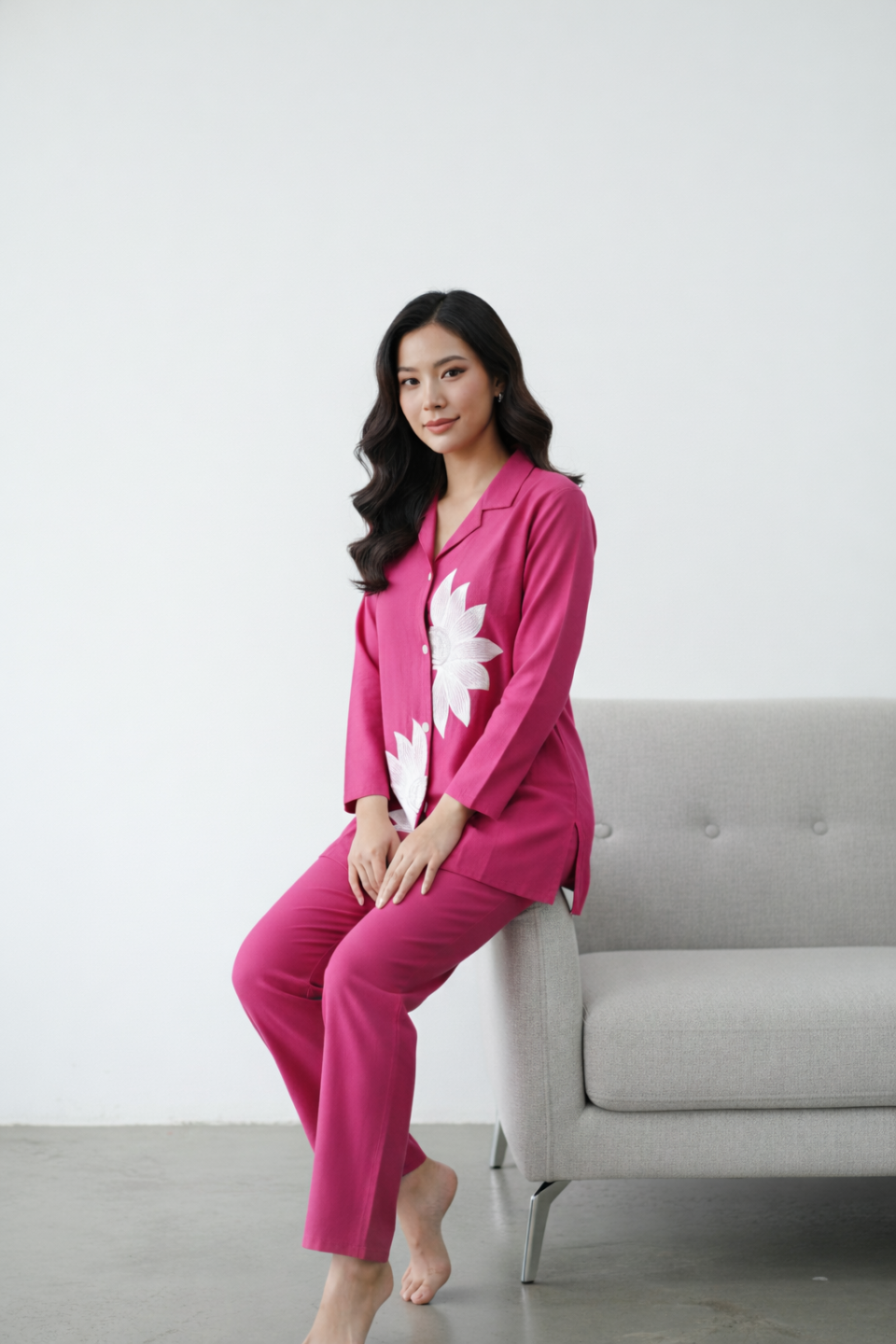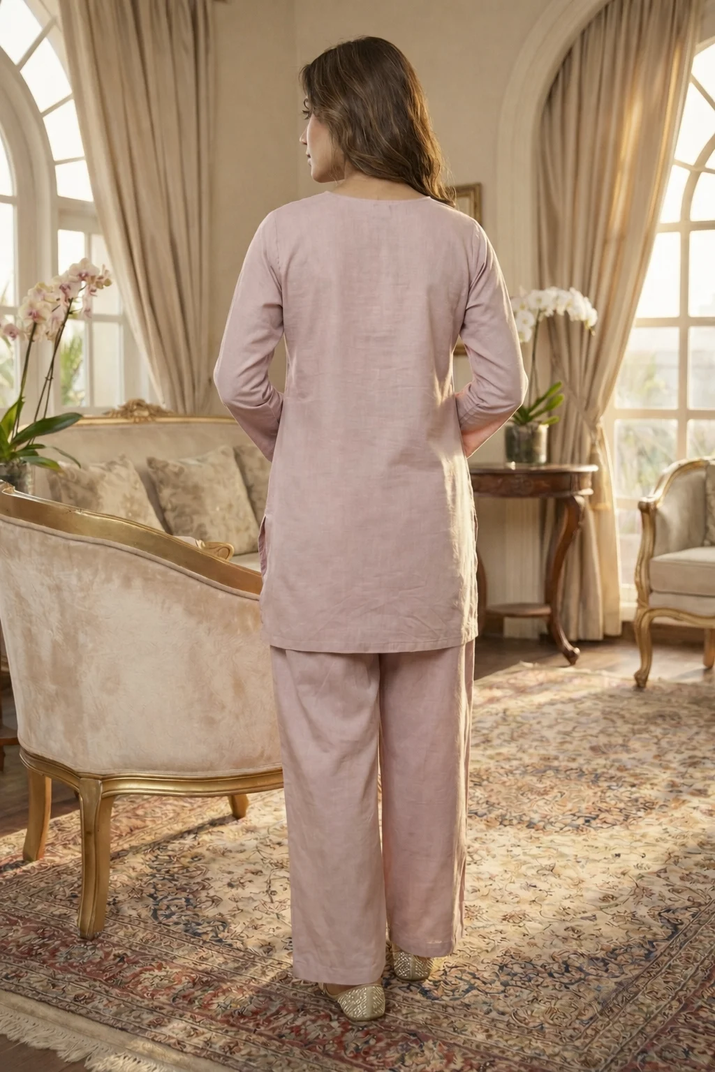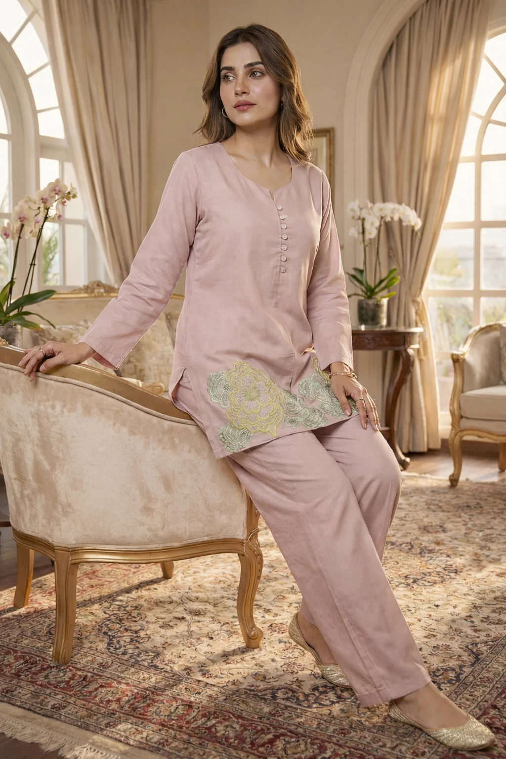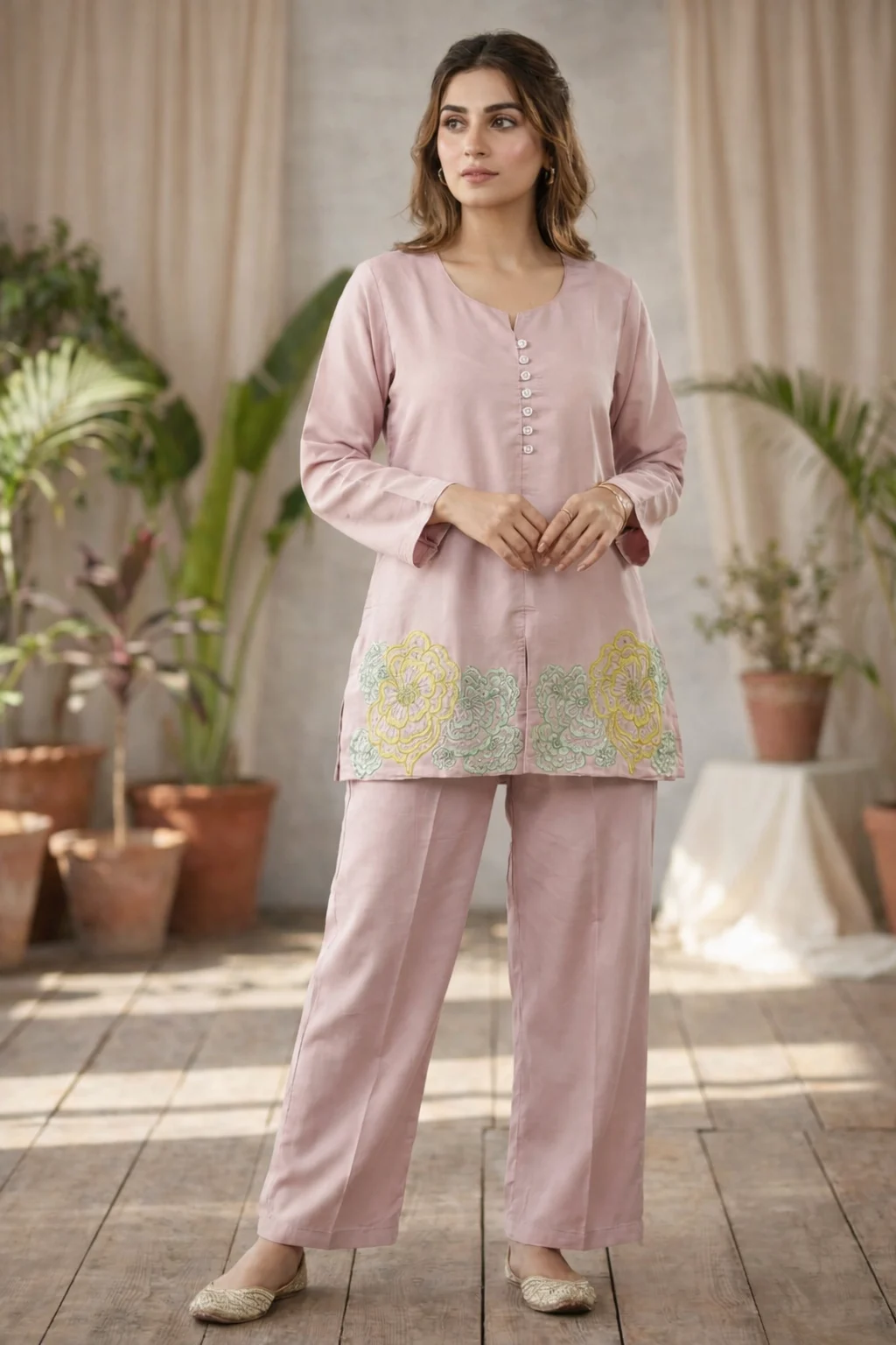 Elegant blush pink co-ord set featuring a straight-fit kurta with delicate floral embroidery on the hem and matching relaxed trousers. Designed for effortless comfort and refined everyday style.