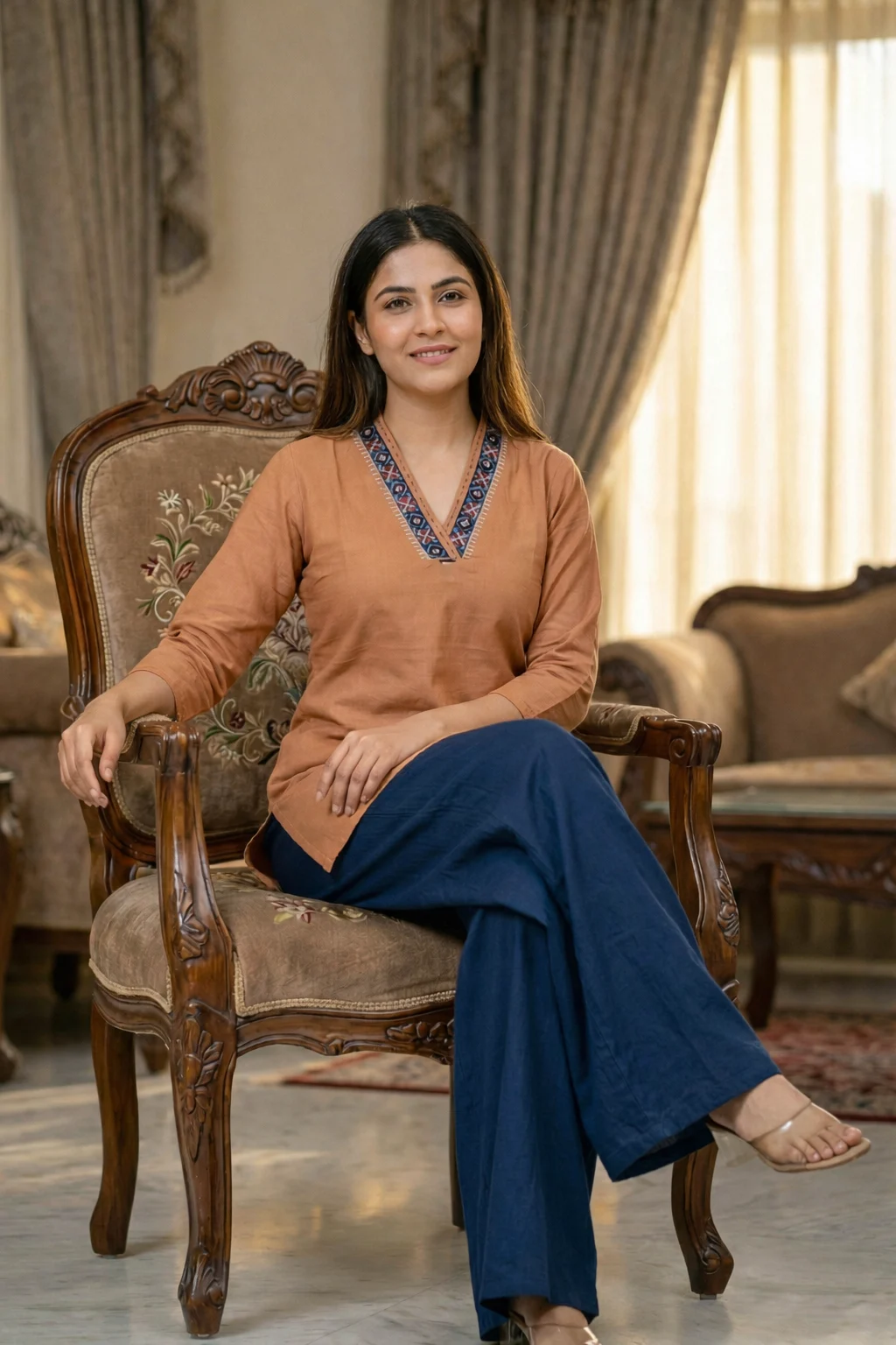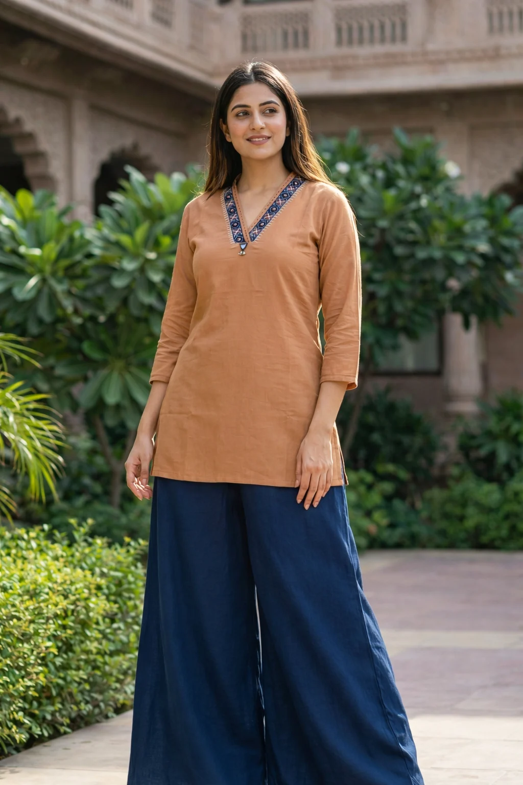 Elegant camel brown short kurti featuring a stylish embroidered V-neckline and comfortable three-quarter sleeves, perfect for casual and everyday ethnic wear.
