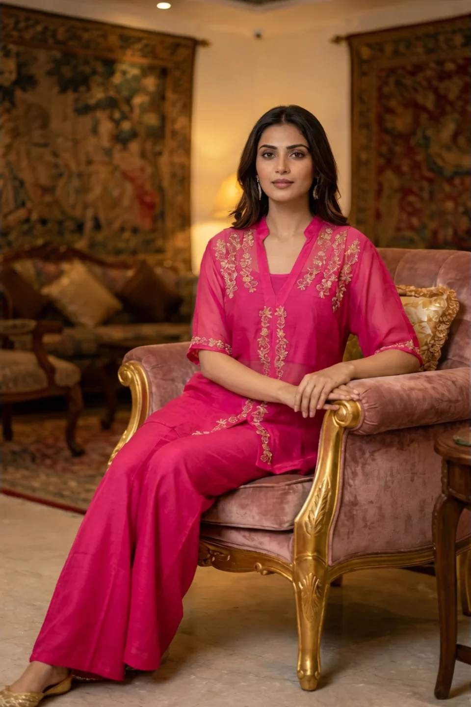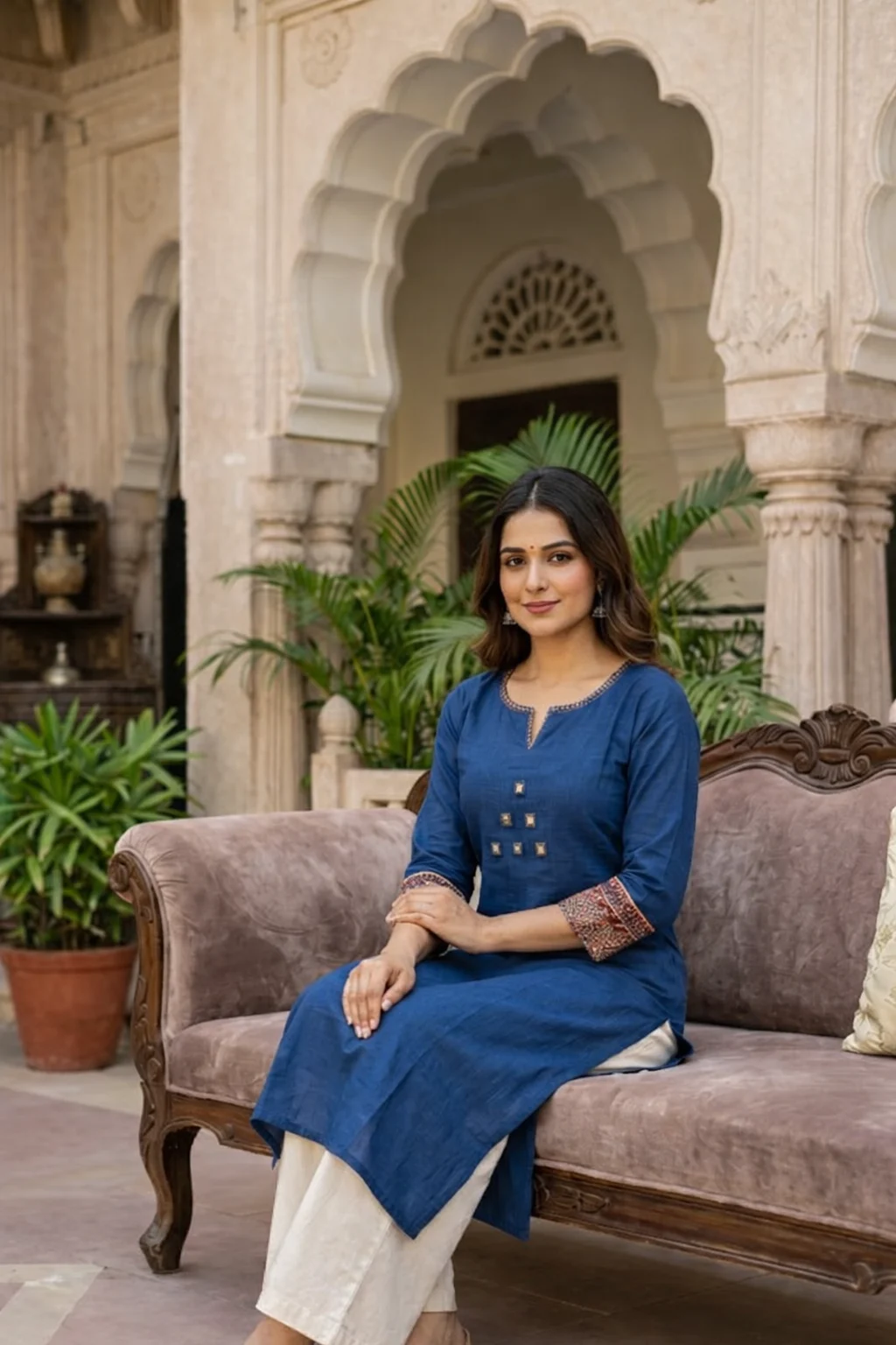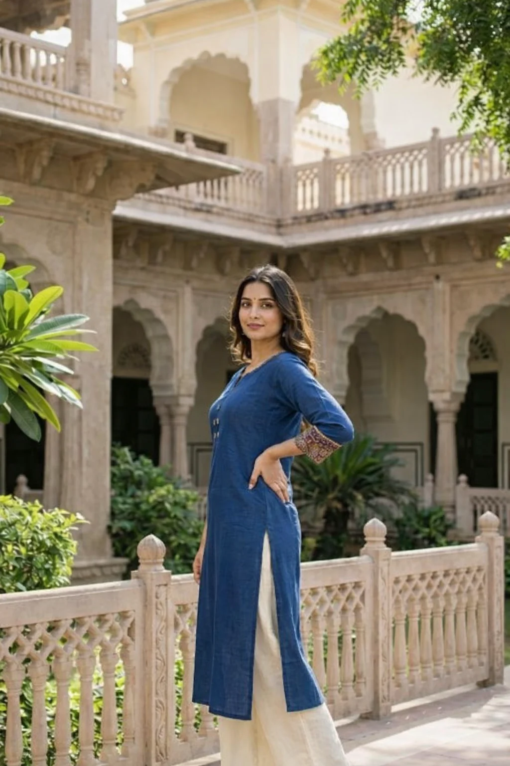 A timeless blue kurti designed in a straight silhouette with subtle neckline detailing and elegant patterned sleeve cuffs. Crafted for everyday comfort with a refined ethnic touch, this versatile piece pairs effortlessly with trousers, palazzos, or jeans — perfect for casual wear, office styling, and minimal festive looks.