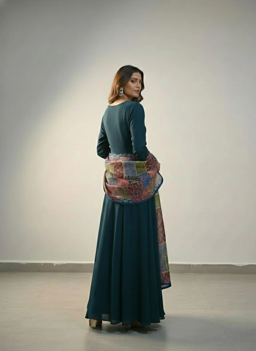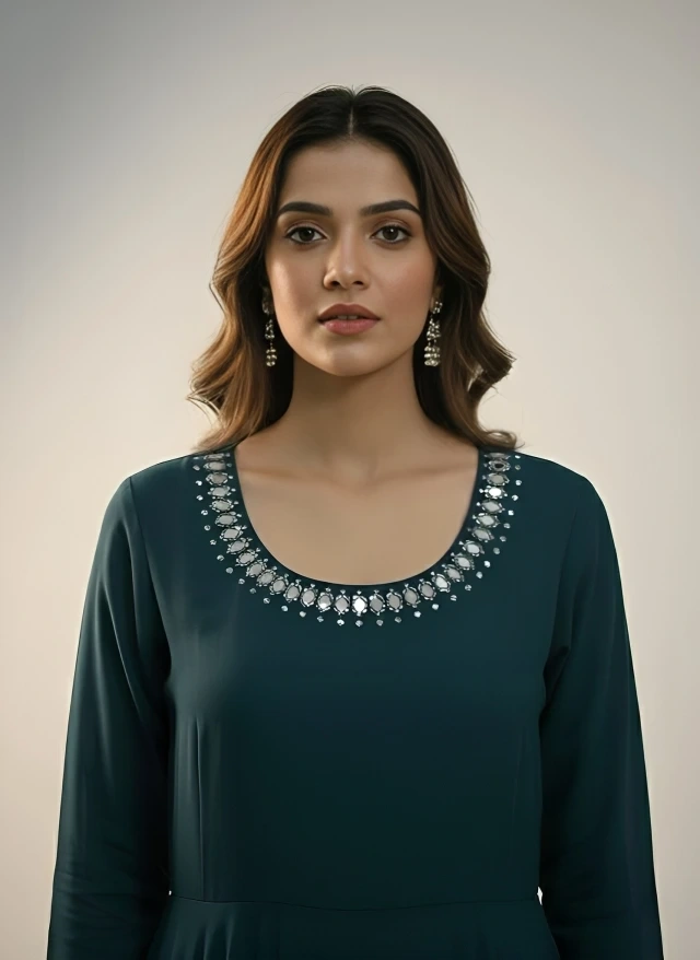 A refined deep teal kurti set featuring elegant neckline embellishments and a beautifully printed dupatta. Designed with a graceful silhouette and premium finish, this set is perfect for festive occasions and elevated ethnic wear.
