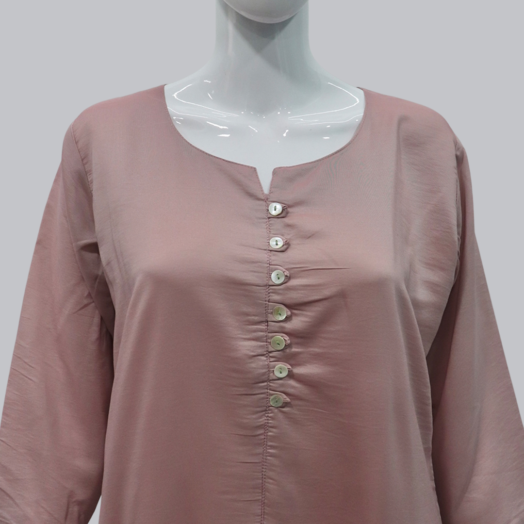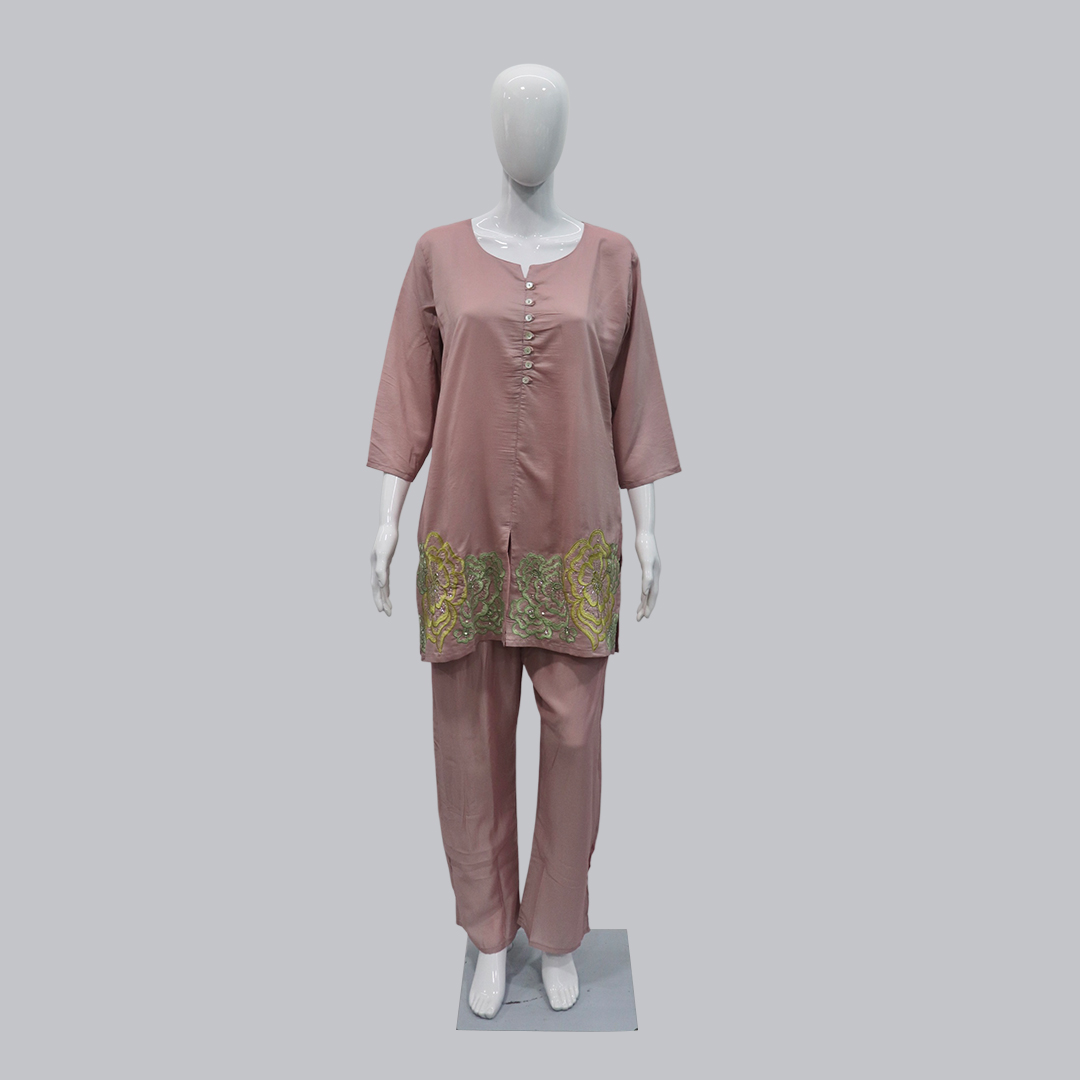 Upgrade your ethnic wardrobe with this dusty pink co-ord set featuring intricate embroidery at the hemline in soft green and yellow tones. The top is designed with a buttoned neckline and 3/4th sleeves, offering a sophisticated yet comfortable appeal. Paired with matching straight-fit pants, this outfit blends modern style with traditional detailing. Crafted from smooth, breathable fabric, it’s ideal for festive occasions, casual gatherings, or office wear.