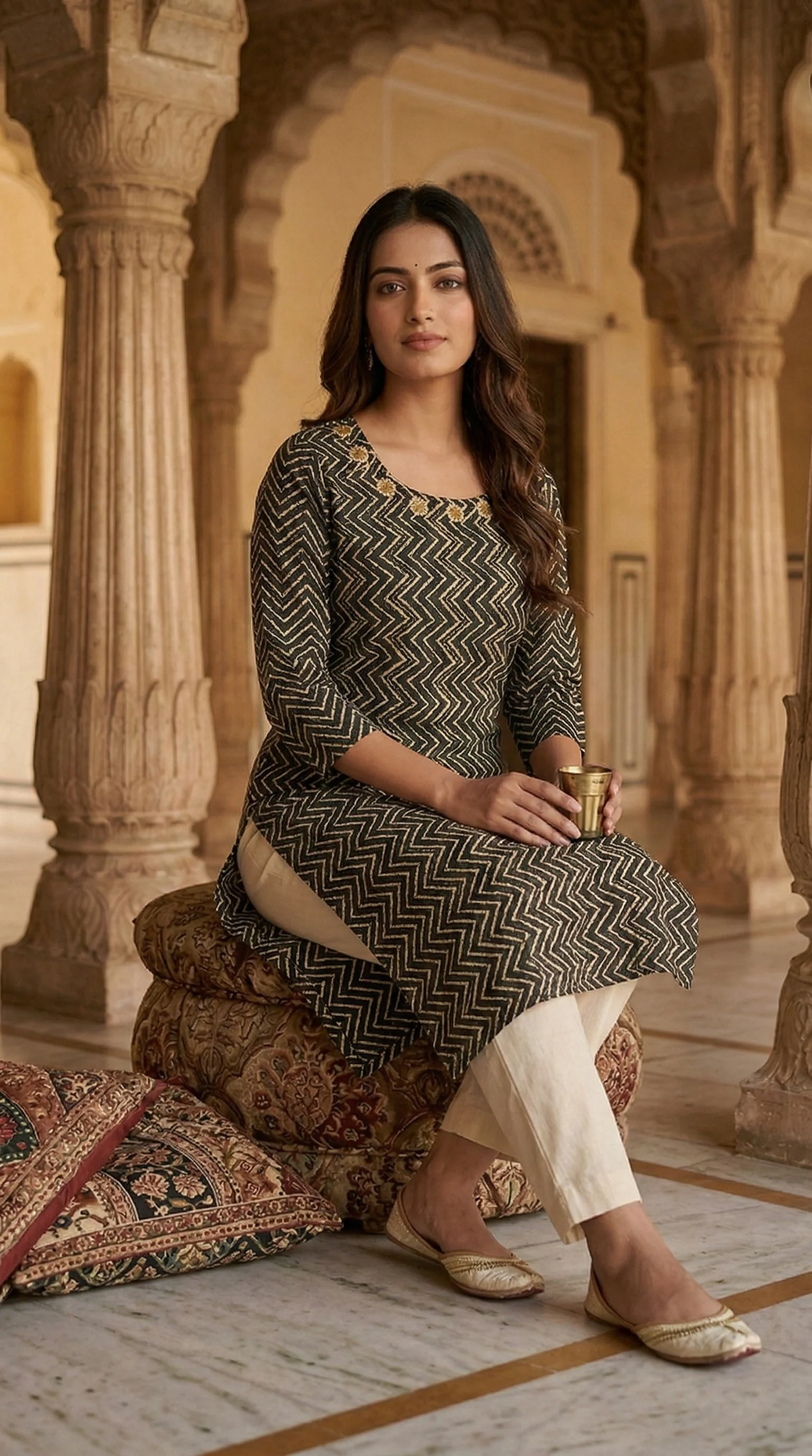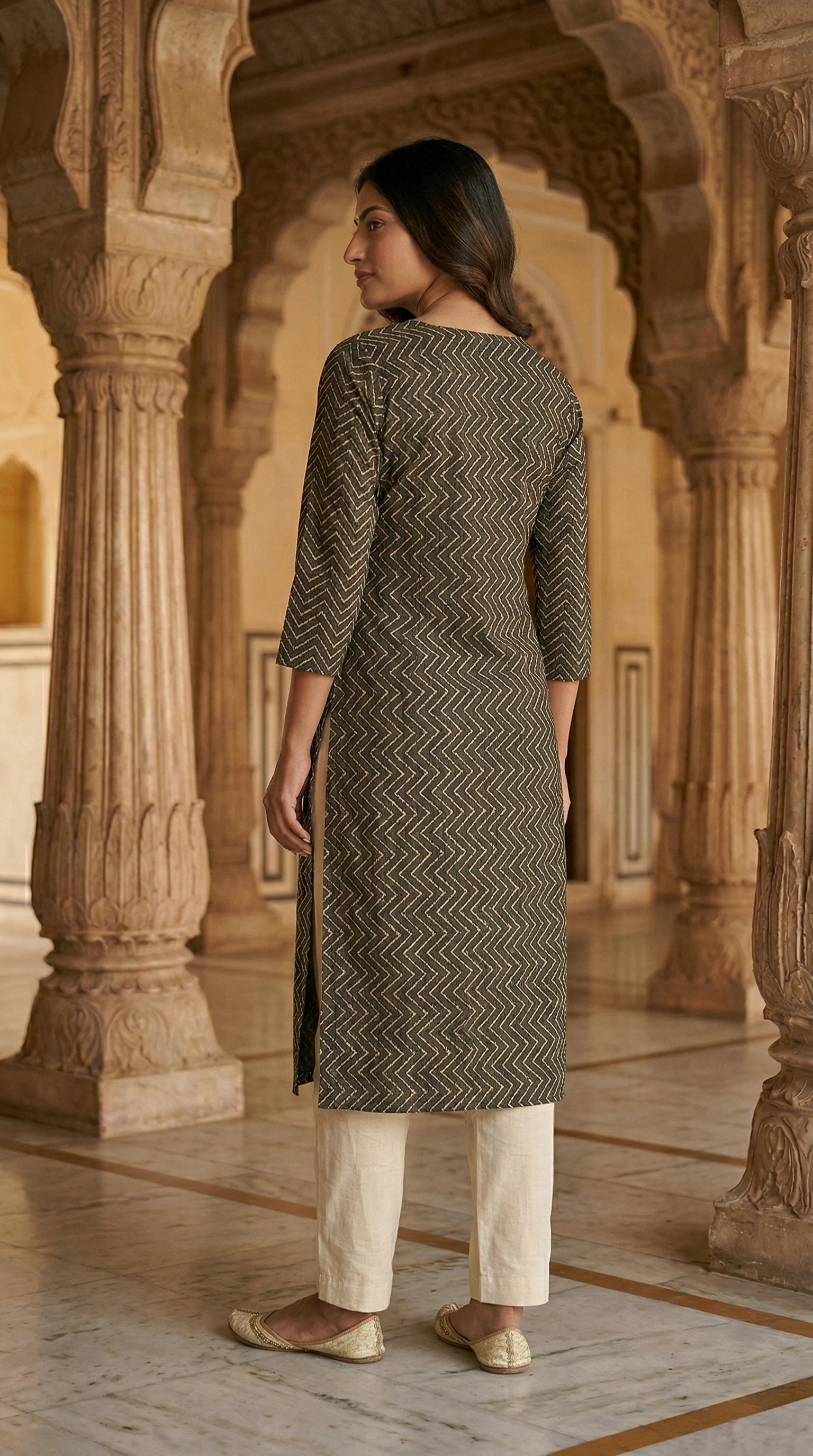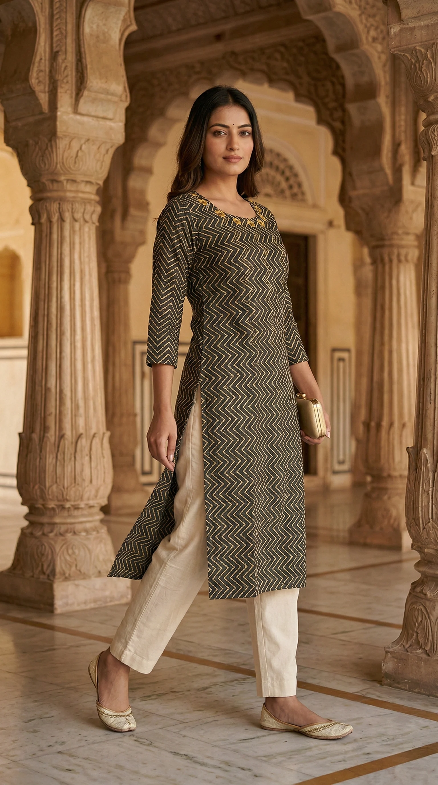 Elevate your ethnic style with this sophisticated straight-fit kurti. Featuring a striking metallic gold chevron (zigzag) pattern on a charcoal black base, it is beautifully accented with intricate gold embroidery around the neckline. Designed with comfortable 3/4 sleeves, this kurti is perfect for both professional office wear and festive celebrations.