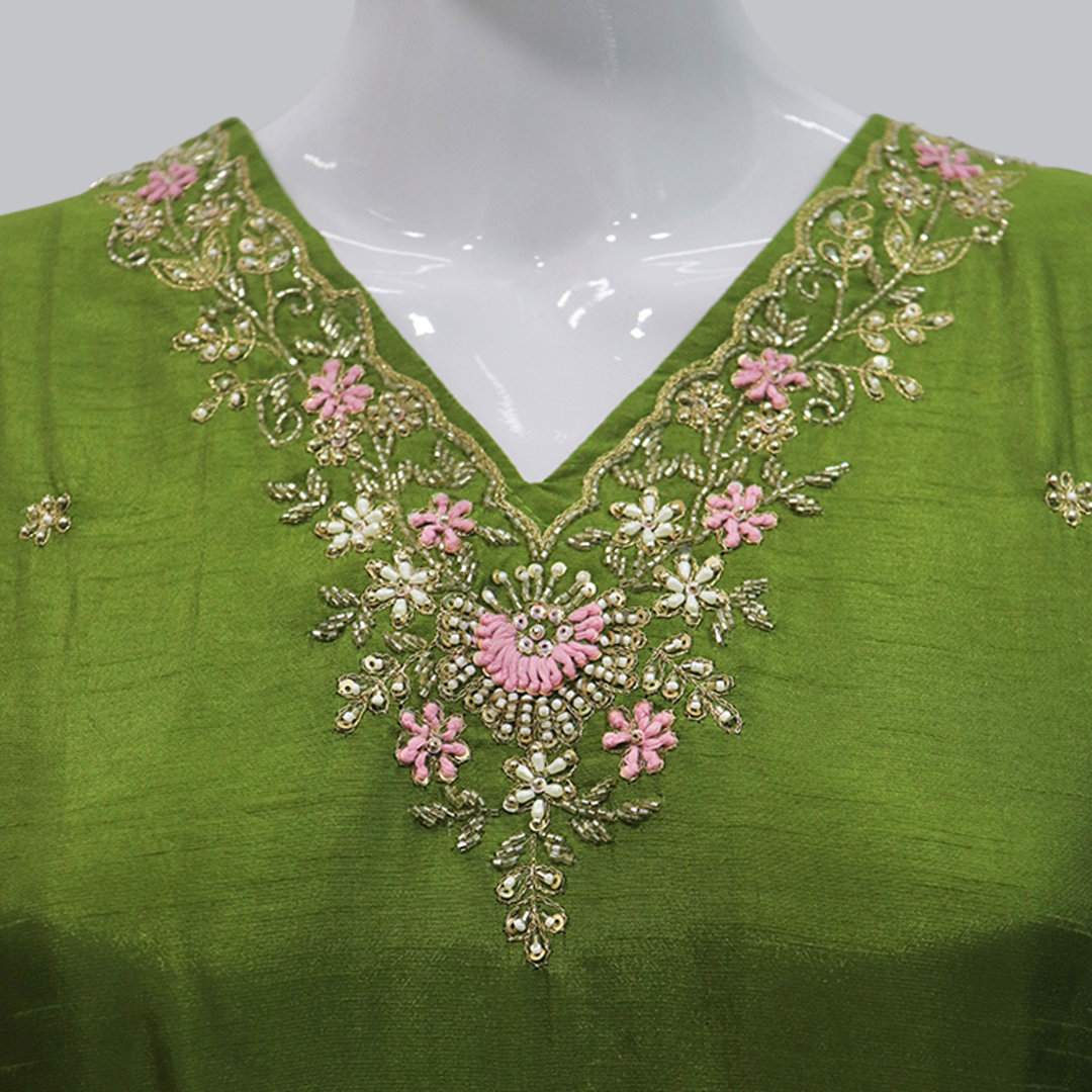Be the first to review “Elegant Olive Green Silk Embroidered Kurti Set”
