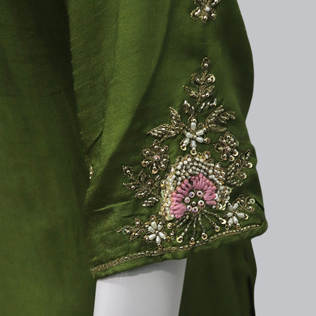 Elegant Olive Green Silk Embroidered Kurti Set