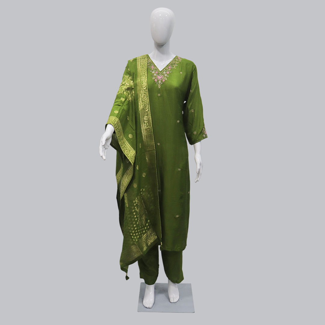 Olive green silk kurti set featuring fine embroidery, floral details, and a woven dupatta — ideal for festive and traditional occasions.