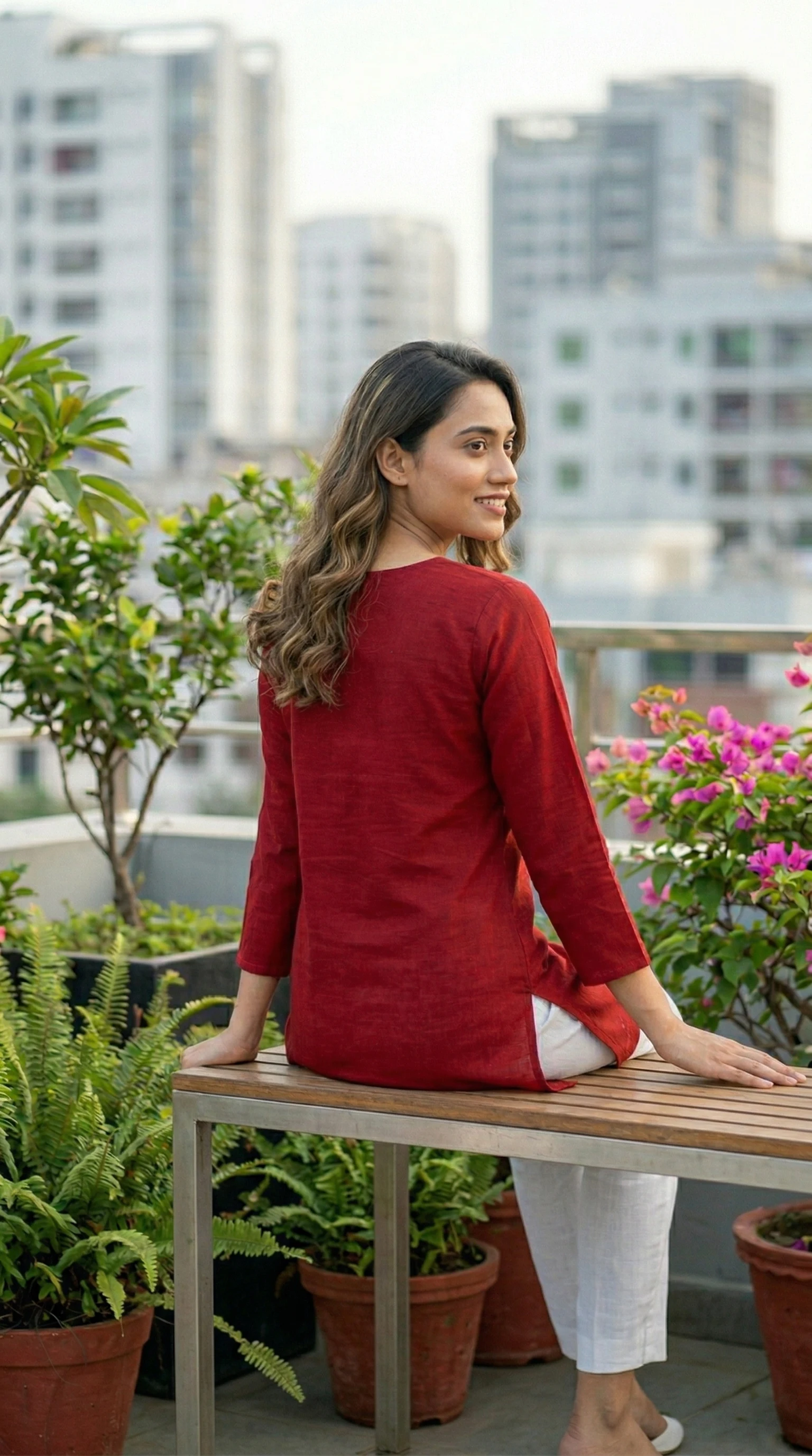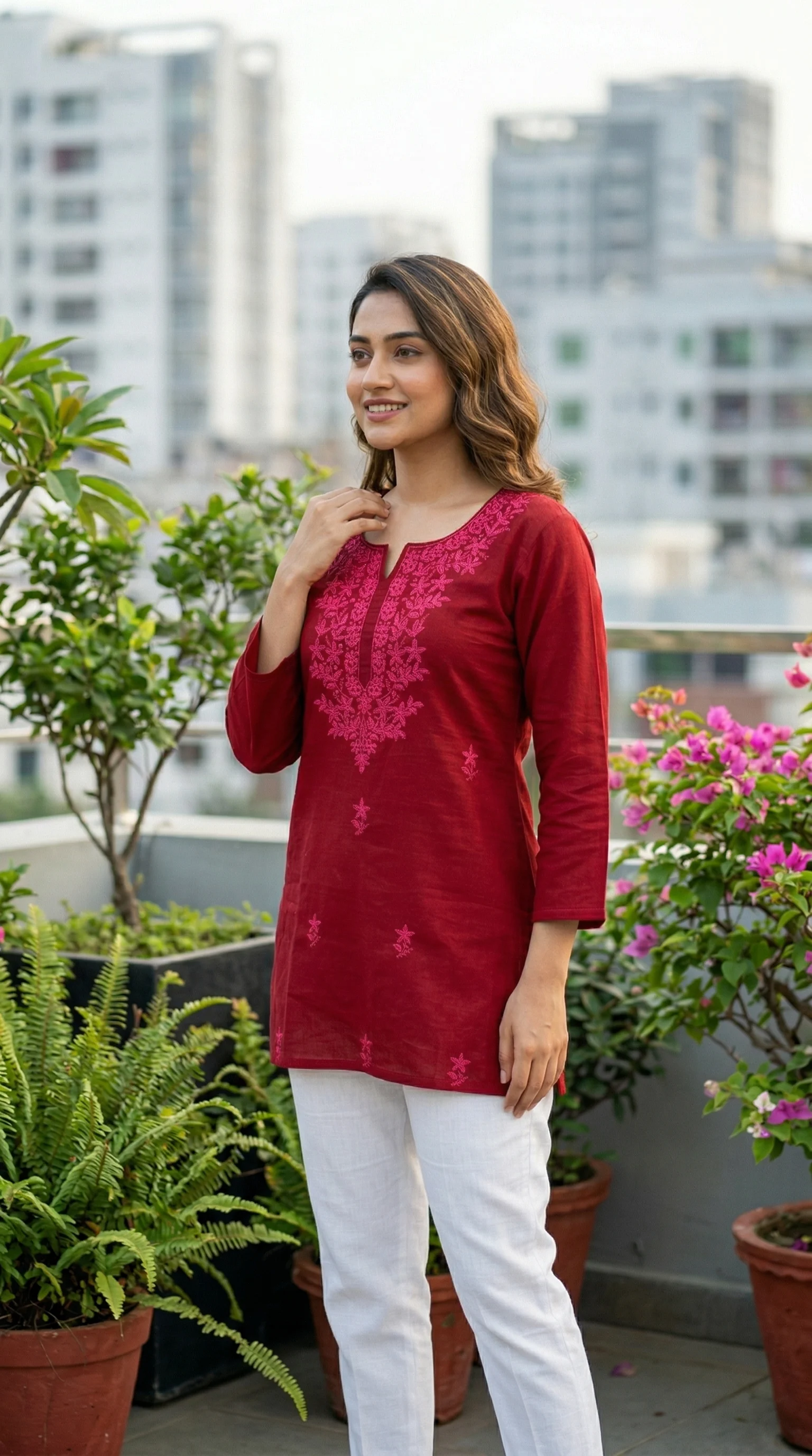 Elegant red short kurti crafted in soft fabric, featuring delicate embroidery on the front. Perfect for casual and semi-formal wear.