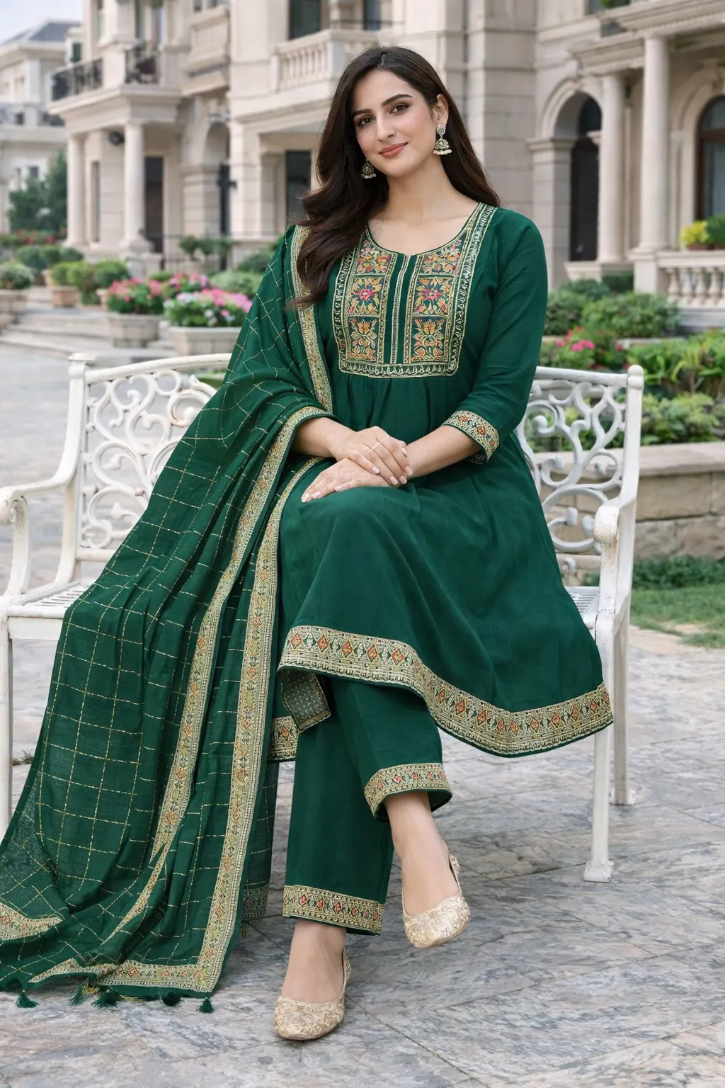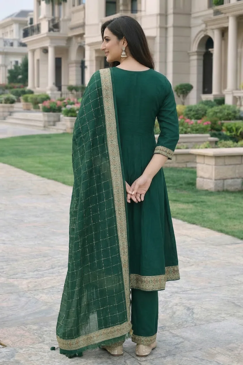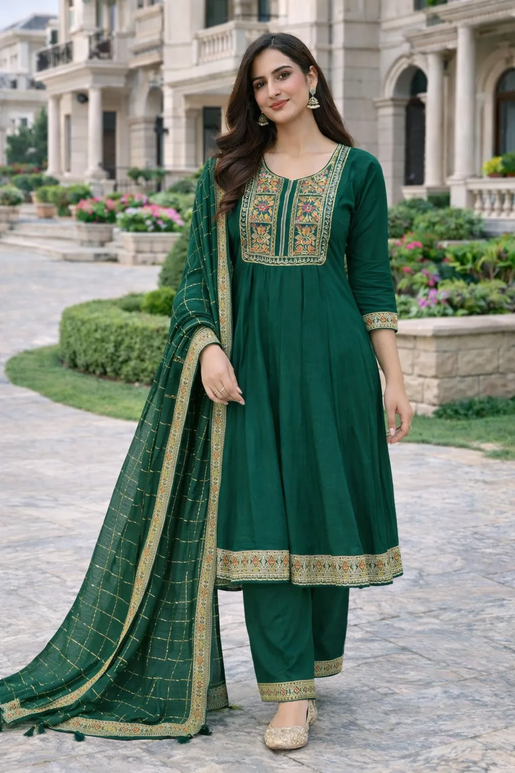Elegant emerald green Anarkali set featuring intricate ethnic embroidery with matching pants and a coordinated dupatta, perfect for festive occasions and traditional gatherings.