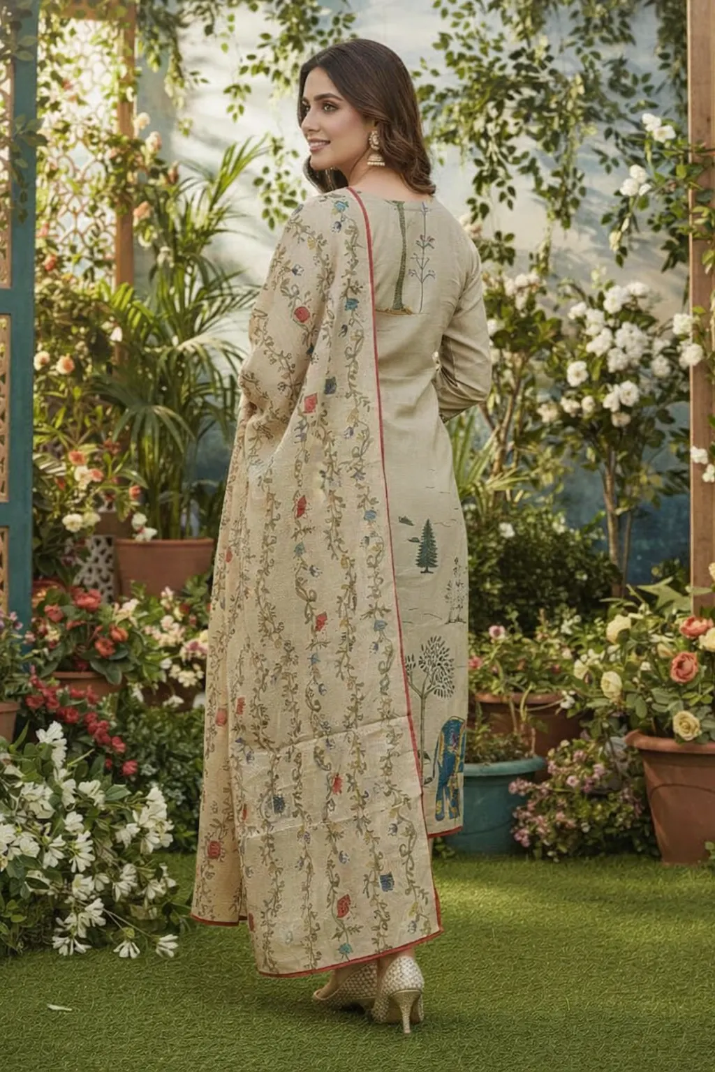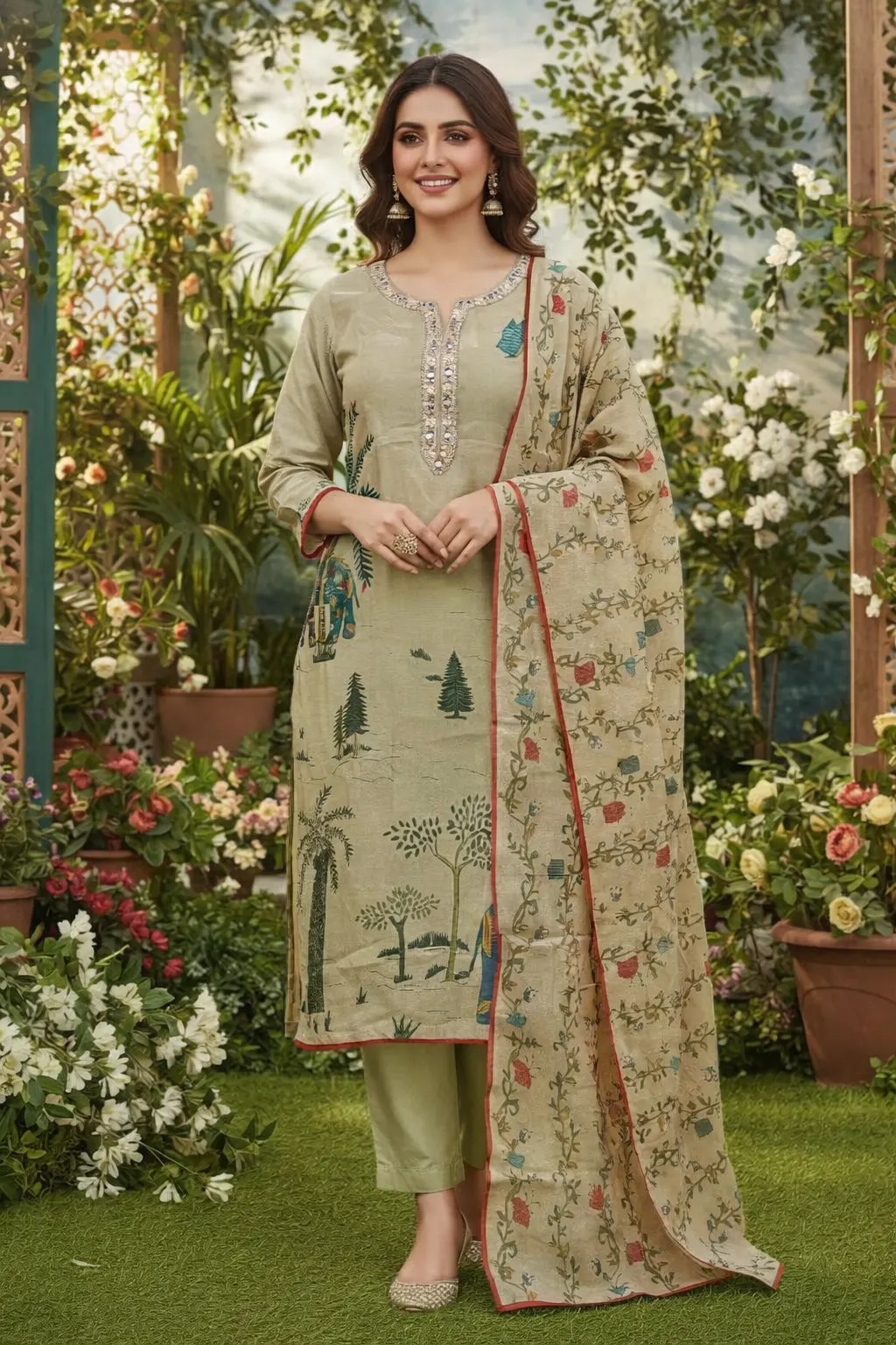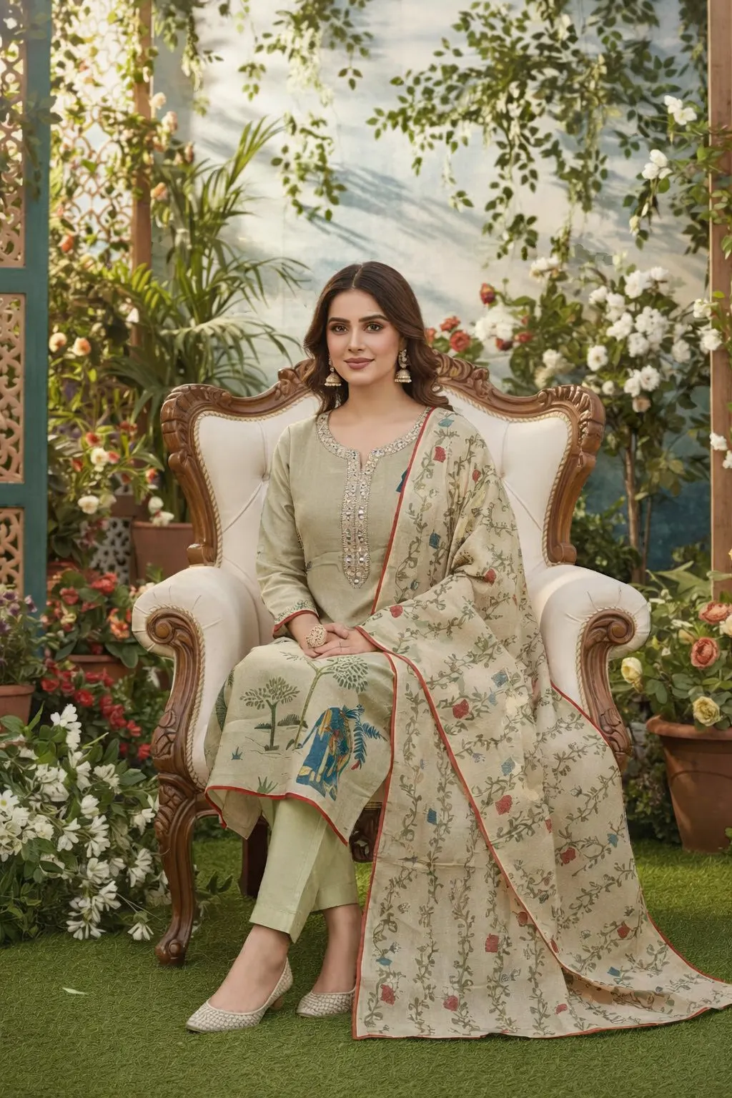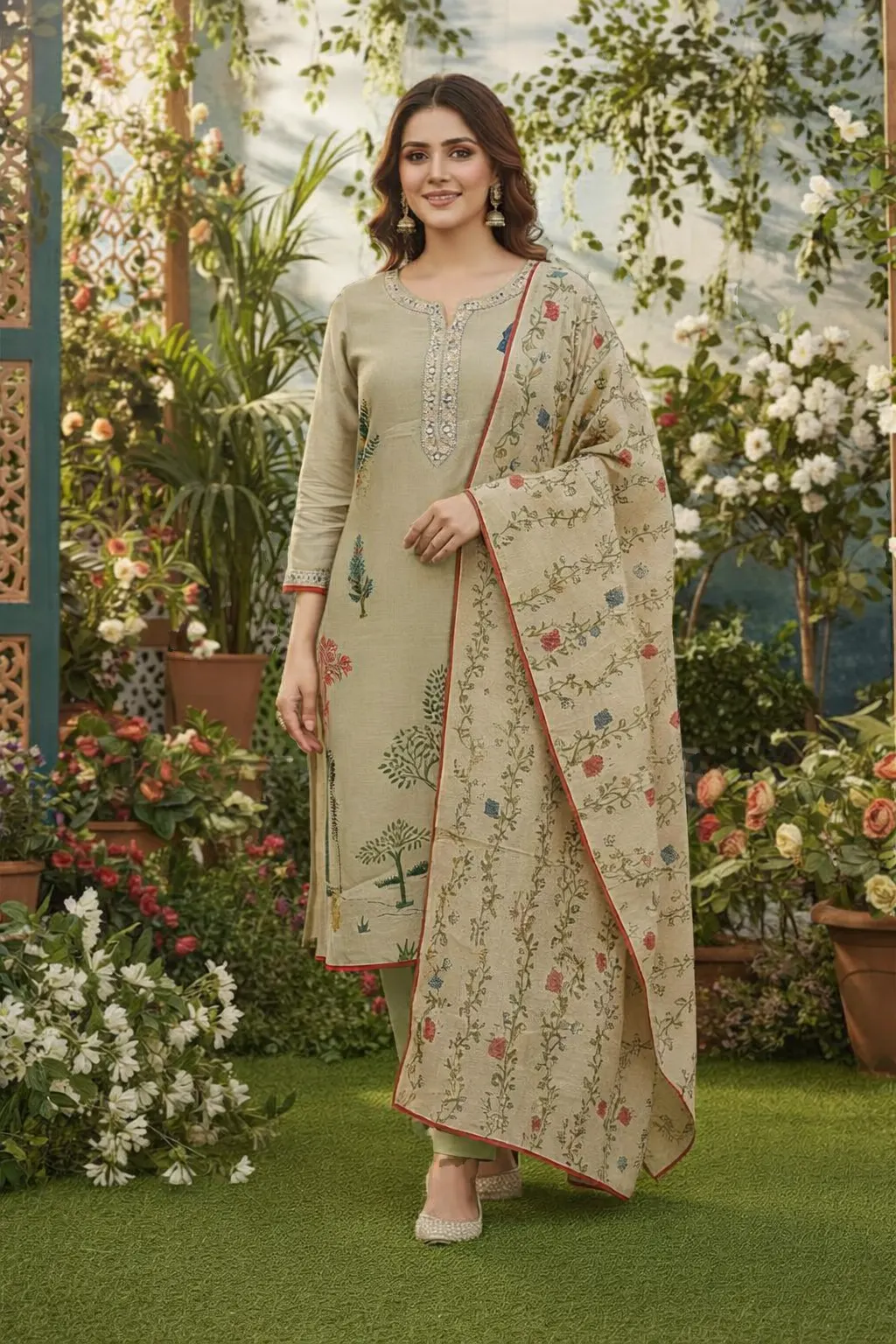 Elevate your everyday elegance with this sage beige lawn suit featuring delicate floral prints and subtle neckline embroidery. Paired with a beautifully printed dupatta, this outfit blends comfort and sophistication, making it perfect for casual gatherings, festive lunches, and seasonal wear.