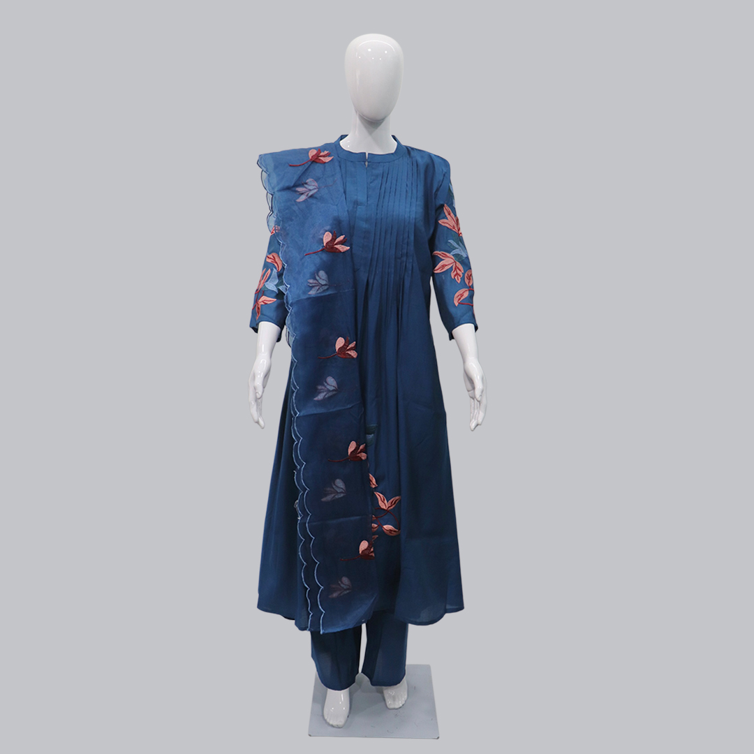 The rich midnight-blue hue adds depth and poise, making this set a timeless choice for festive occasions, family get-togethers, or elegant evenings. The straight-fit kurti pairs beautifully with coordinated pants and a lightweight dupatta for a complete ethnic look that blends comfort with style.
