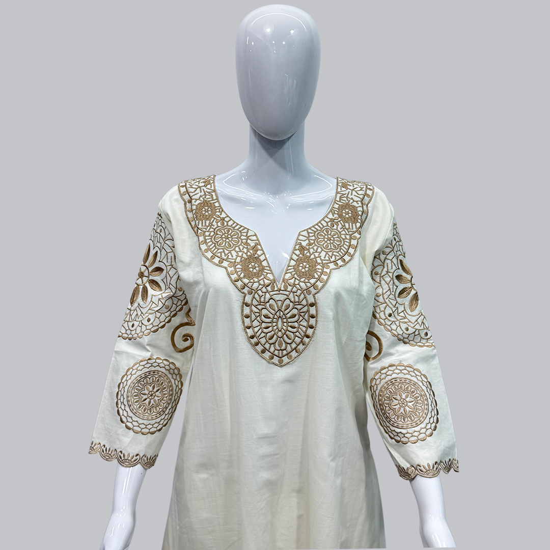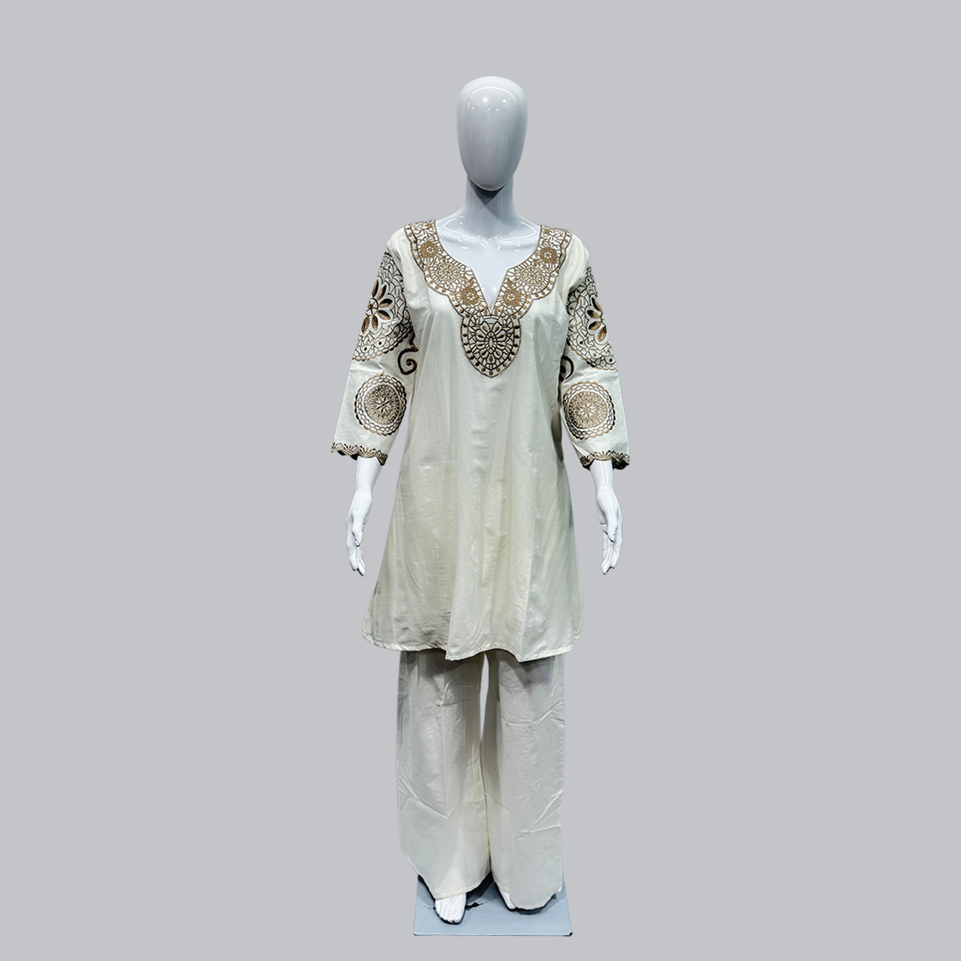 Add a touch of elegance to your ethnic wardrobe with this stunning ivory embroidered co-ord set. The top features rich thread embroidery on the neckline and sleeves, designed in artistic circular motifs that give it a regal appeal. Paired with wide-leg matching pants, this ensemble offers both comfort and class. Perfect for festive occasions, family gatherings, or casual celebrations, this co-ord set blends traditional detailing with modern charm. Crafted from soft, lightweight fabric to keep you stylish and comfortable all day long.