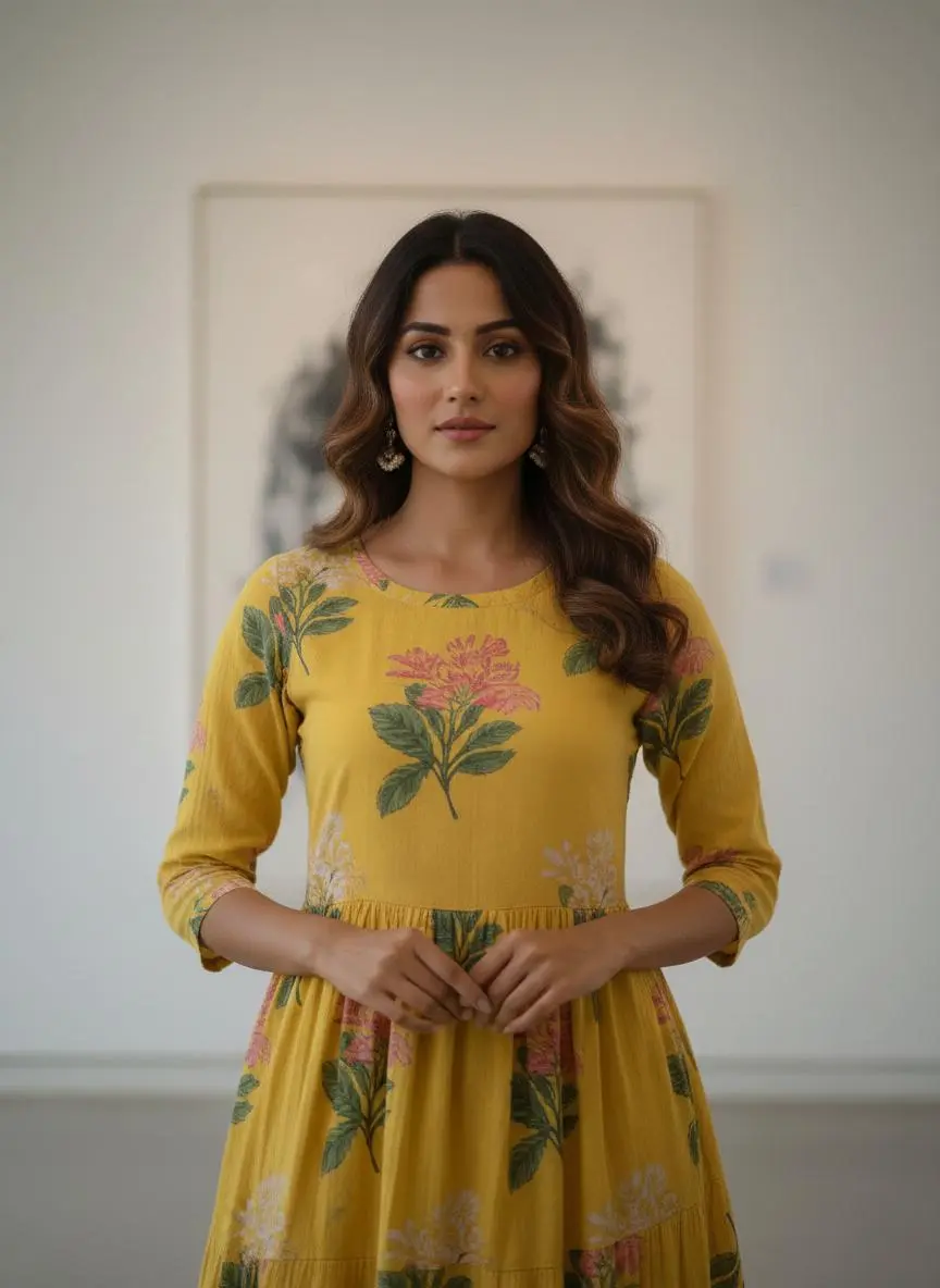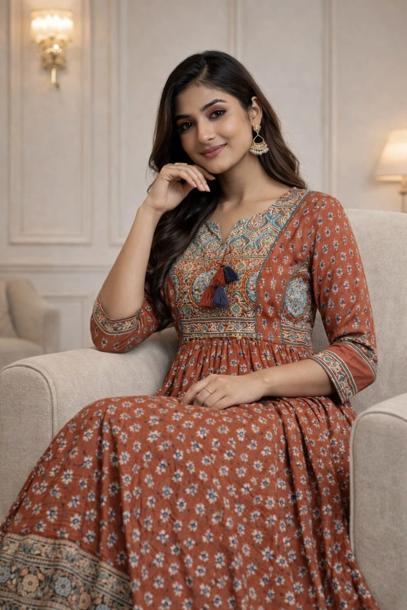An elegant white gown designed with a flowy silhouette and subtle detailing. The soft fabric and relaxed fit make it a perfect choice for comfortable daily wear and effortless home styling.