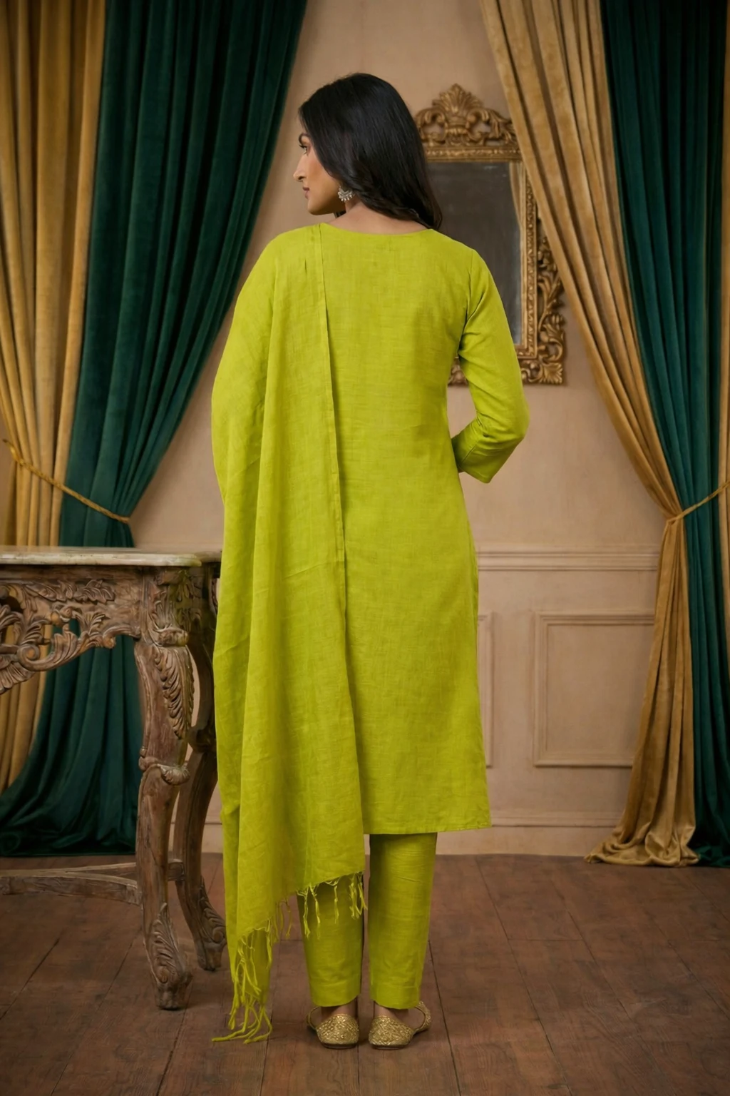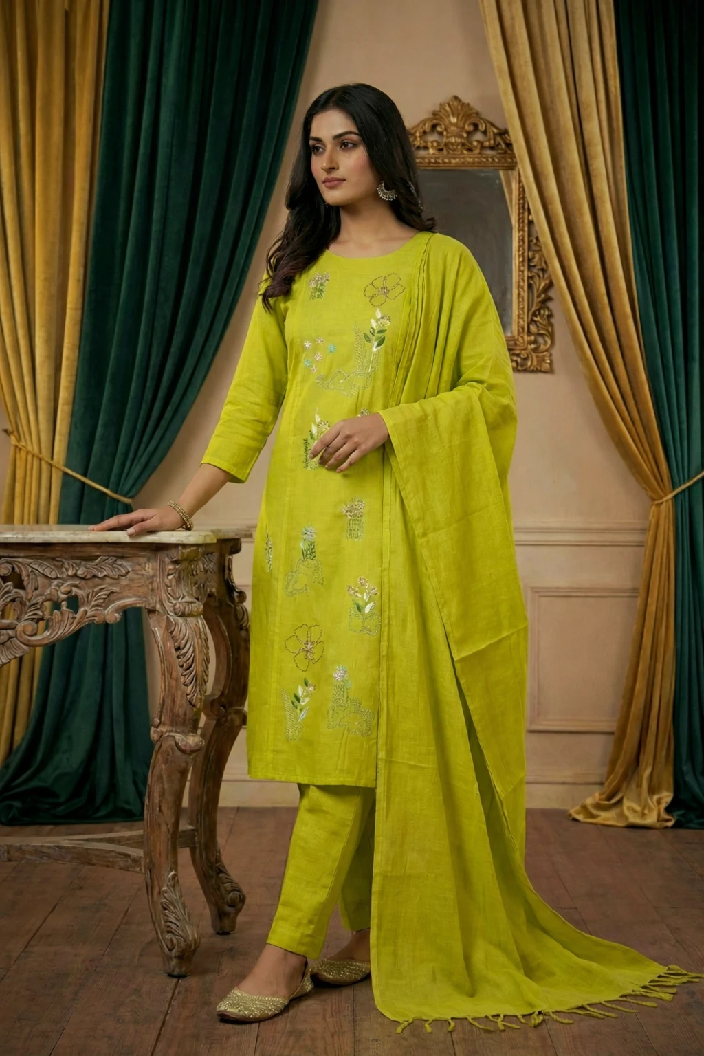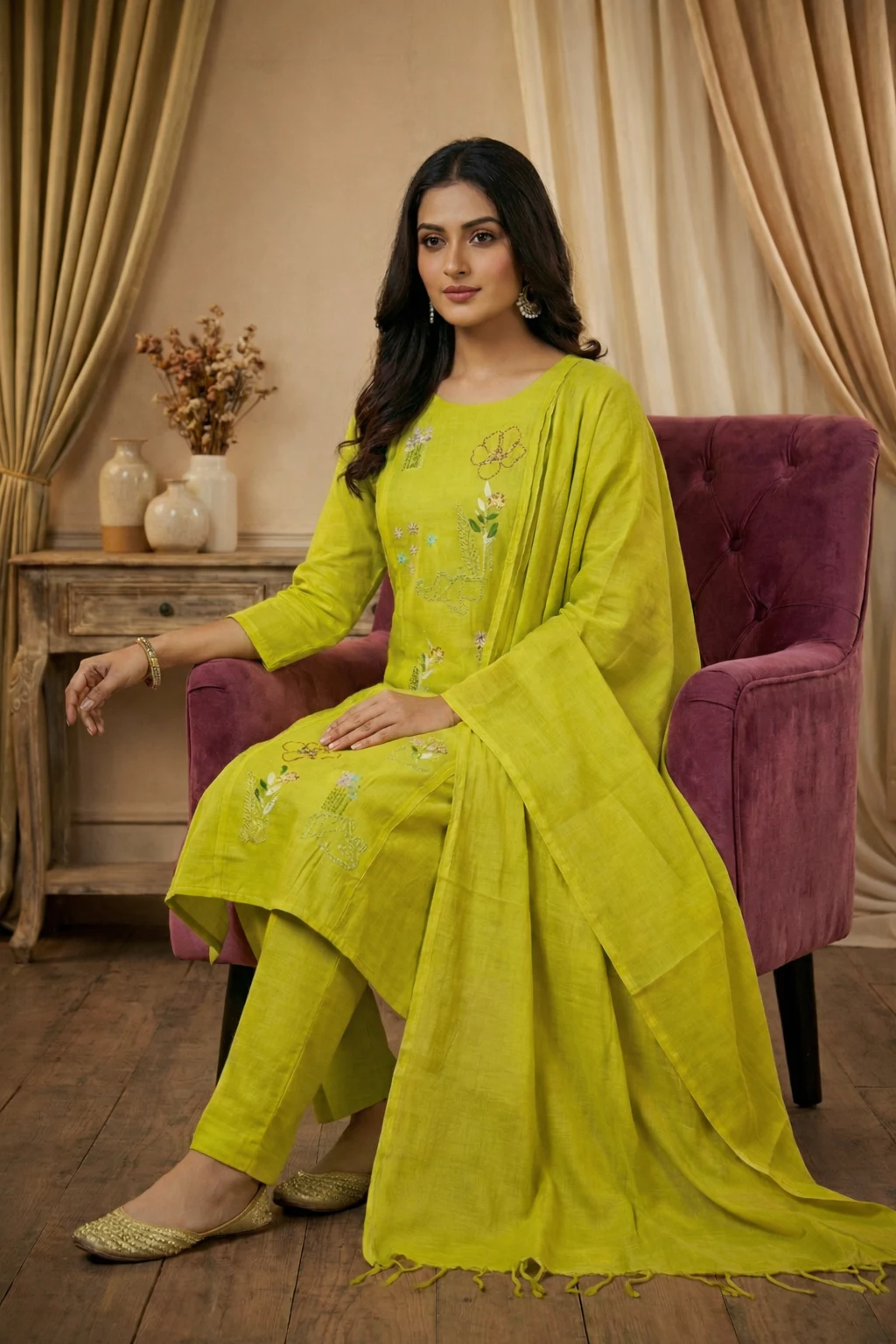 Elegant lime green kurta set crafted in soft breathable fabric, featuring delicate floral embroidery on the front panel. Paired with matching straight pants and a coordinated dupatta, this outfit is perfect for festive gatherings, casual celebrations, and daytime events. Comfortable, graceful, and effortlessly stylish.