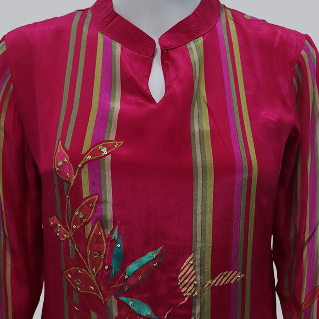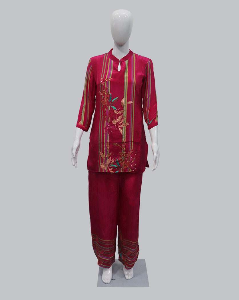 Add a touch of vibrant charm to your wardrobe with this elegant magenta floral co-ord set. Crafted from soft, breathable rayon blend fabric, this outfit features intricate floral motifs and subtle stripe detailing for a chic and graceful look. The mandarin collar kurta pairs perfectly with matching printed pants, making it an ideal choice for festive gatherings, casual outings, or elegant office wear.