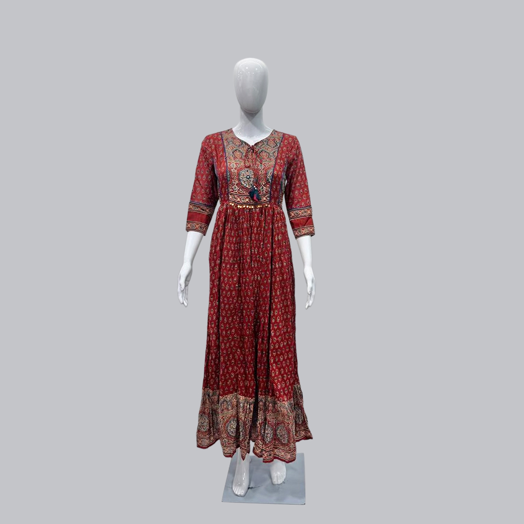 Step into timeless elegance with this stunning maroon printed anarkali gown. Designed with detailed ethnic motifs, this gown features a flattering flared silhouette, 3/4th sleeves, and a V-neckline adorned with intricate patterns. The rich maroon base with contrasting border print adds a regal touch, making it ideal for festive occasions, family gatherings, or cultural events. Crafted from soft, breathable fabric, this gown offers both comfort and a graceful fall — a must-have for your ethnic collection.