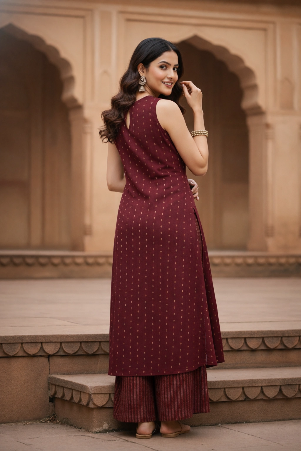 Be the first to review “Maroon Sleeveless Printed Kurti Palazzo Set” Cancel reply