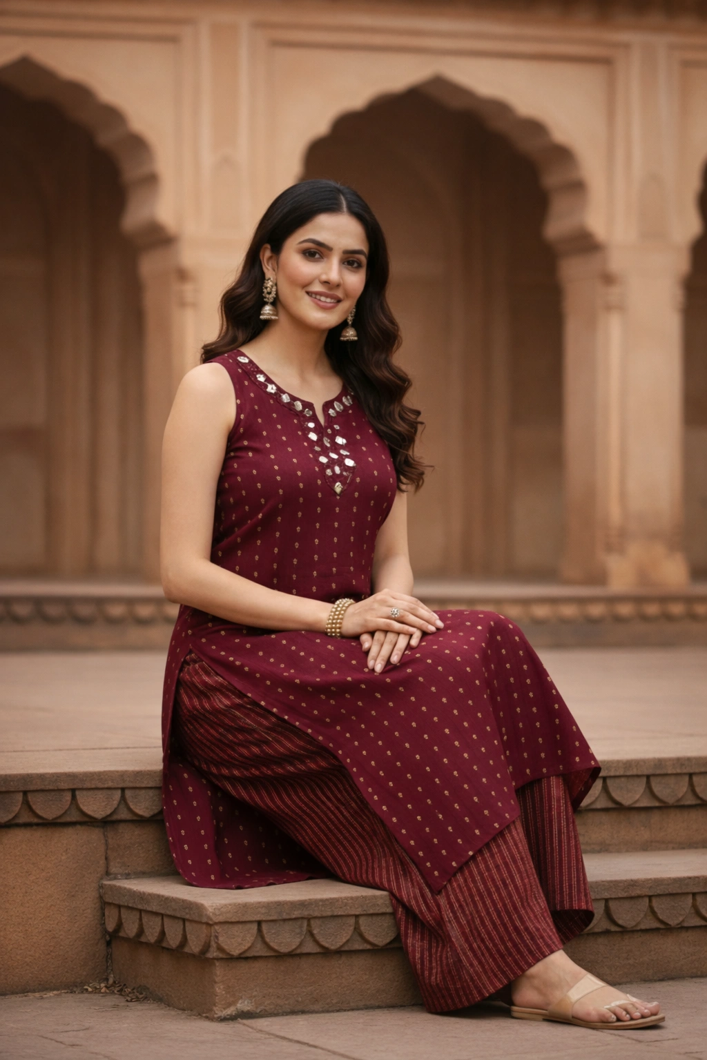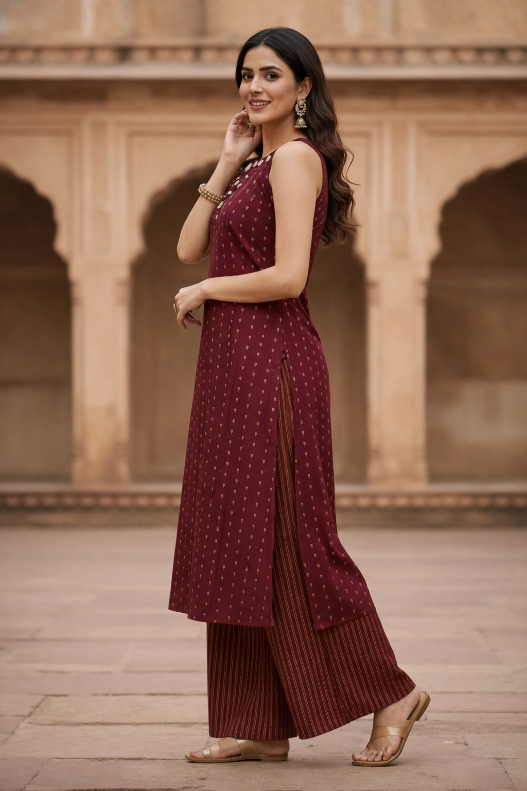 Elegant maroon sleeveless kurti palazzo set featuring golden butti print and straight-cut kurti with side slits. Paired with matching striped palazzo pants, perfect for festive wear, ethnic occasions and casual celebrations.