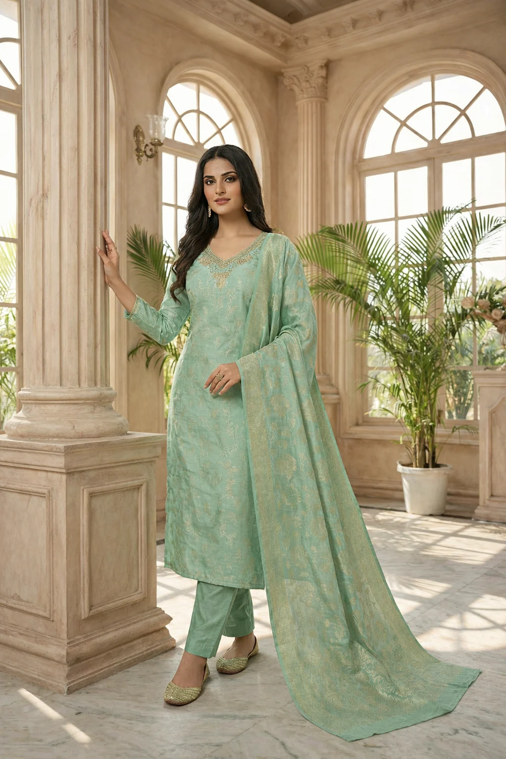 Elegant mint green kurta set featuring delicate jacquard floral prints, a graceful V-neckline, and a lightweight matching dupatta. Perfect for festive occasions and refined everyday wear.