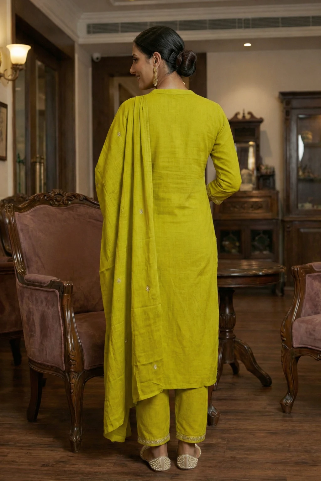 Radiate elegance in this stunning mustard kurta set, beautifully detailed with delicate floral embroidery on the neckline and subtle motifs across the fabric. Paired with matching straight pants and a soft dupatta, this outfit blends traditional charm with modern sophistication—perfect for festive gatherings, evening events, and refined daywear.