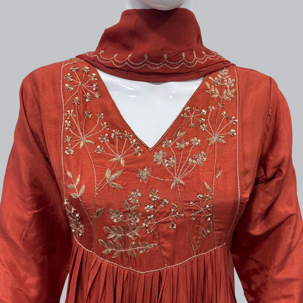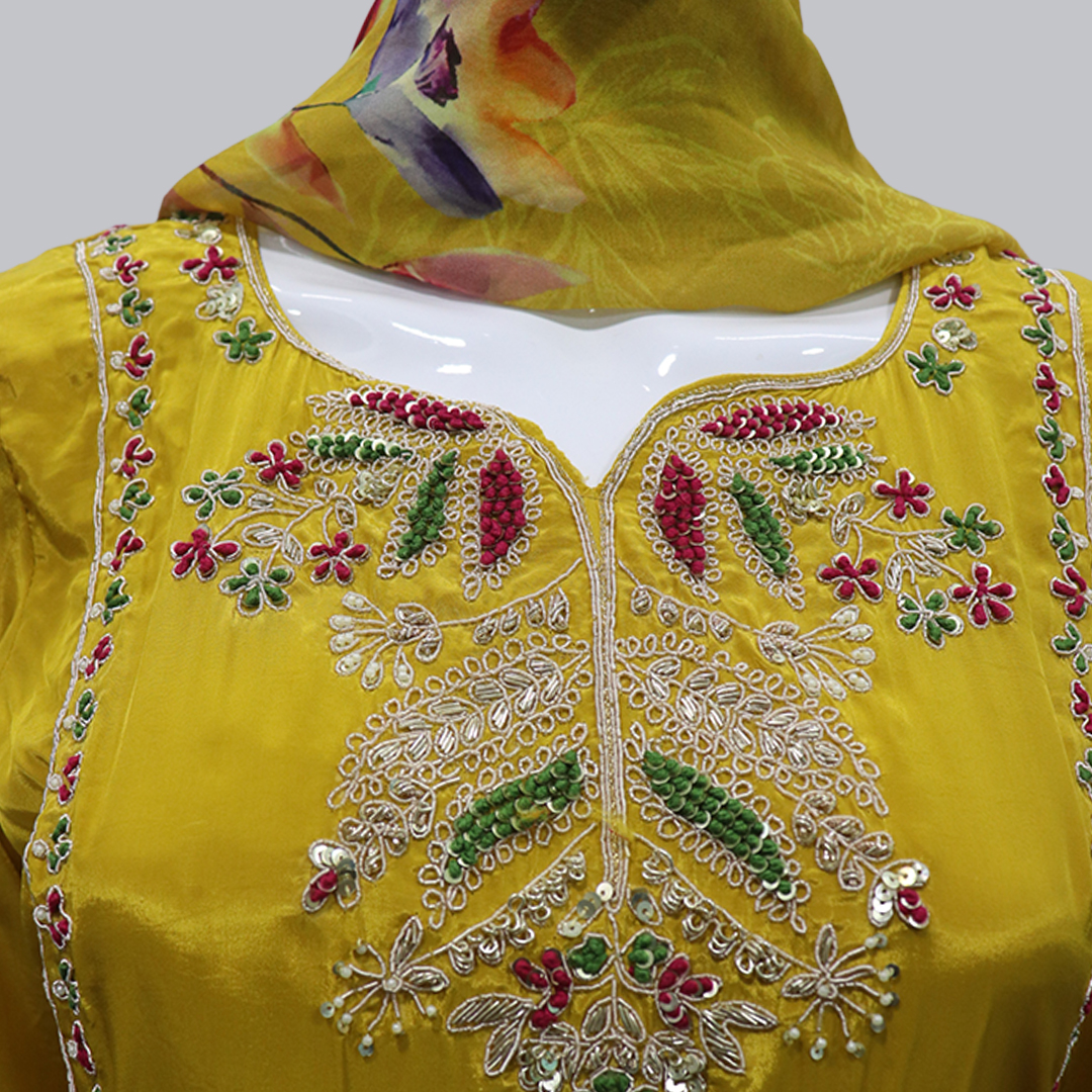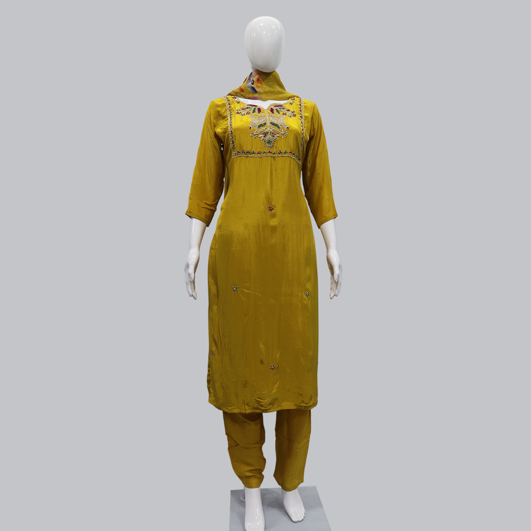 Brighten up your ethnic look with this Mustard Yellow Embroidered Kurti Set from Gulorian. Crafted in a rich mustard hue, the kurti features exquisite multicolor embroidery on the front yoke and delicate motifs scattered across the fabric, adding a touch of traditional charm. The smooth, flowy texture offers a comfortable fit, while the matching pants and printed dupatta complete the elegant ensemble. Perfect for festive occasions, family gatherings, and cultural celebrations.