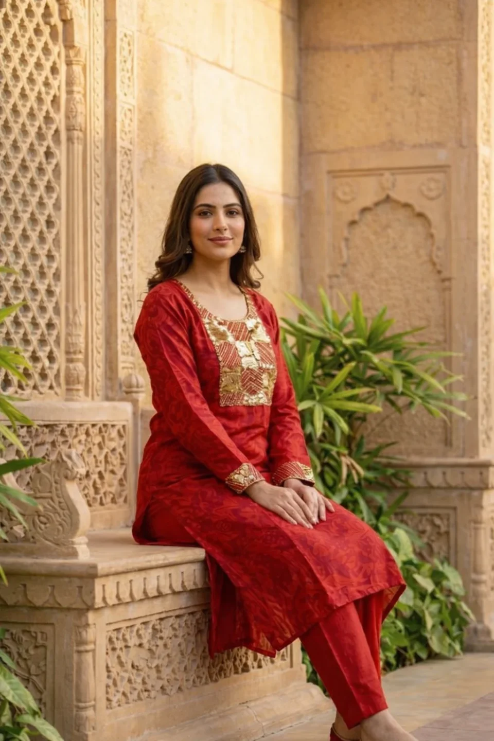 Crafted from premium breathable fabric, this three-piece set features a beautifully structured long kurta adorned with intricate floral hand-embroidery on the yoke in vibrant shades of orange and sage green. The set is paired with matching wide-leg palazzos for a modern yet comfortable silhouette and a lightweight dupatta with subtle gold accents. Perfect for haldi ceremonies, festive gatherings, or elegant daytime events.