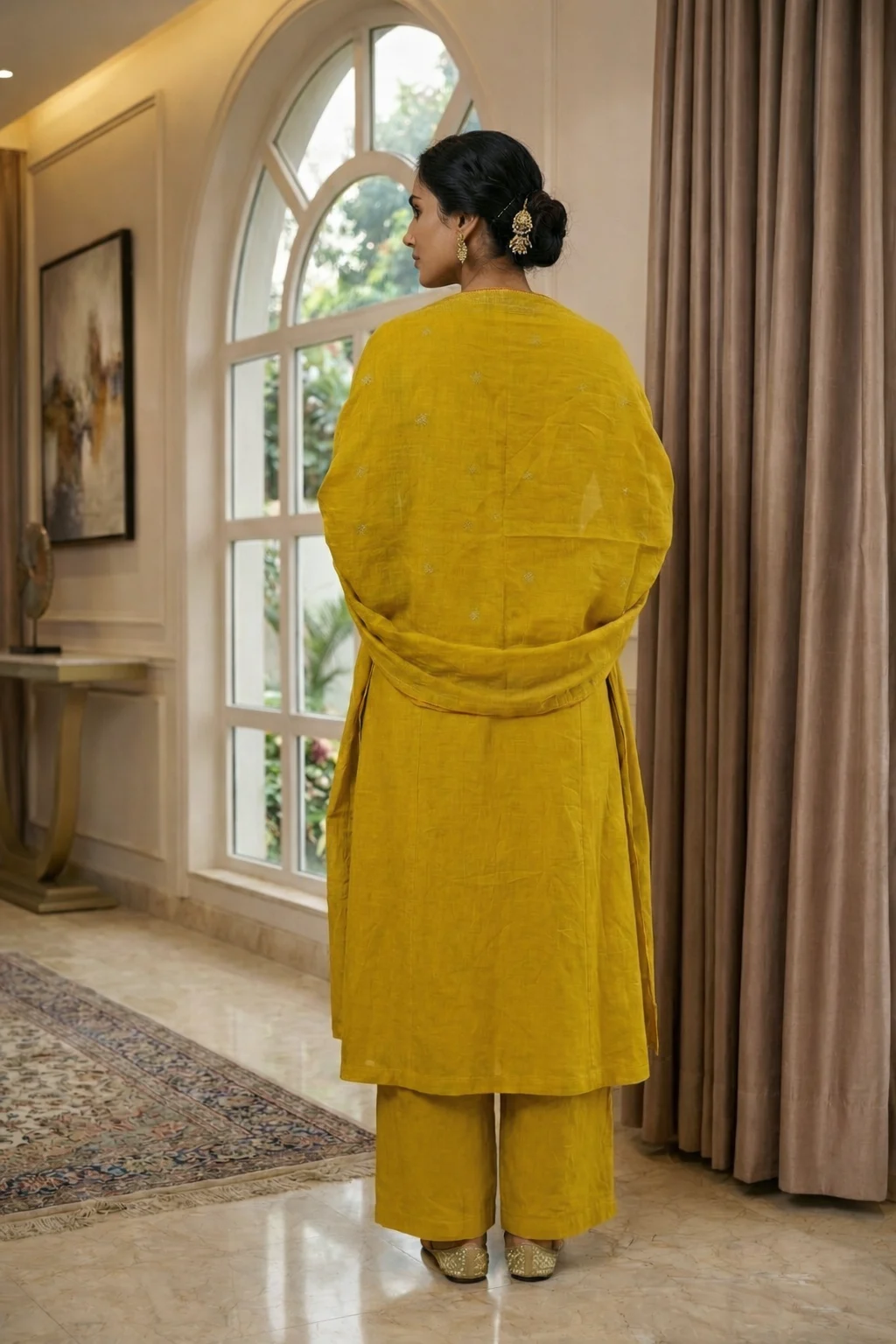 Be the first to review “Mustard Yellow Hand-Embroidered Kurta Set with Wide-Leg Palazzos and Dupatta” Cancel reply