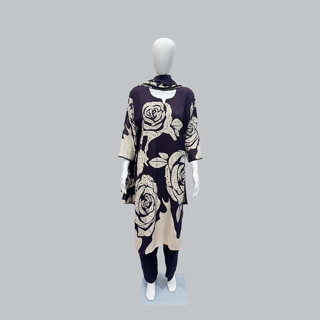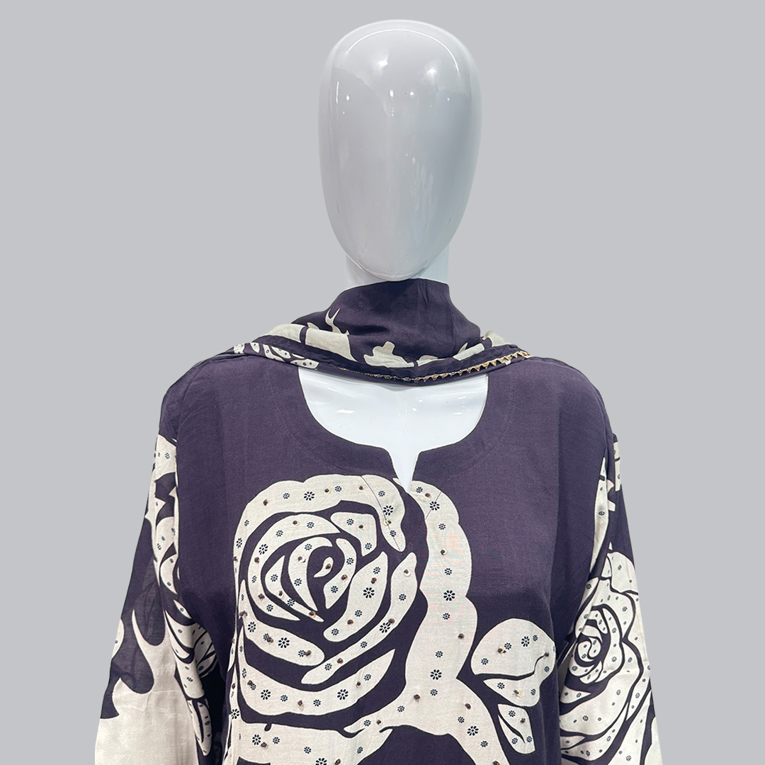 Add a modern twist to your ethnic wardrobe with this navy blue and beige floral printed kurti set from Gulorian. Crafted from soft, breathable fabric, this outfit features oversized rose prints that make a bold fashion statement. The straight-fit kurti is paired with matching pants and a coordinating dupatta for a complete, graceful look. Perfect for casual outings, festive gatherings, or everyday wear, this set combines effortless comfort with striking design.