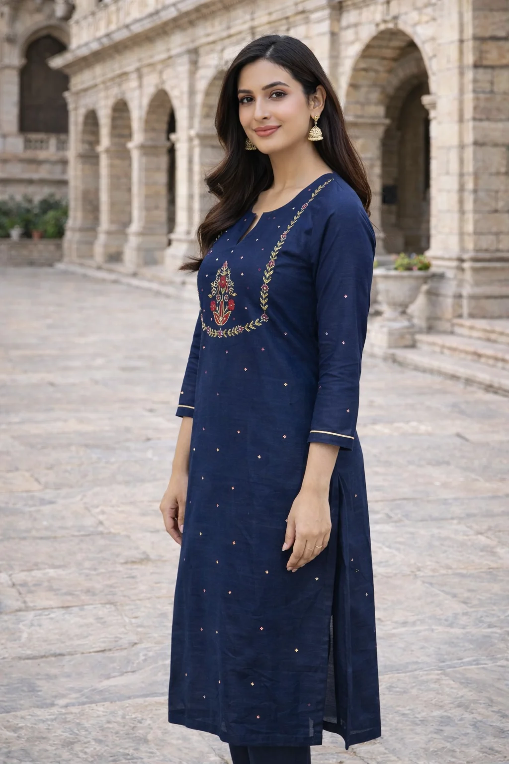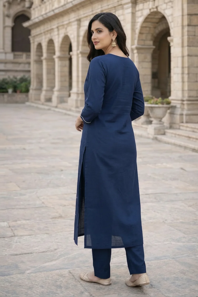 Elegant navy blue kurta set featuring delicate ethnic embroidery on the neckline and subtle motifs across the fabric. Designed for a refined traditional look suitable for festive and casual occasions.