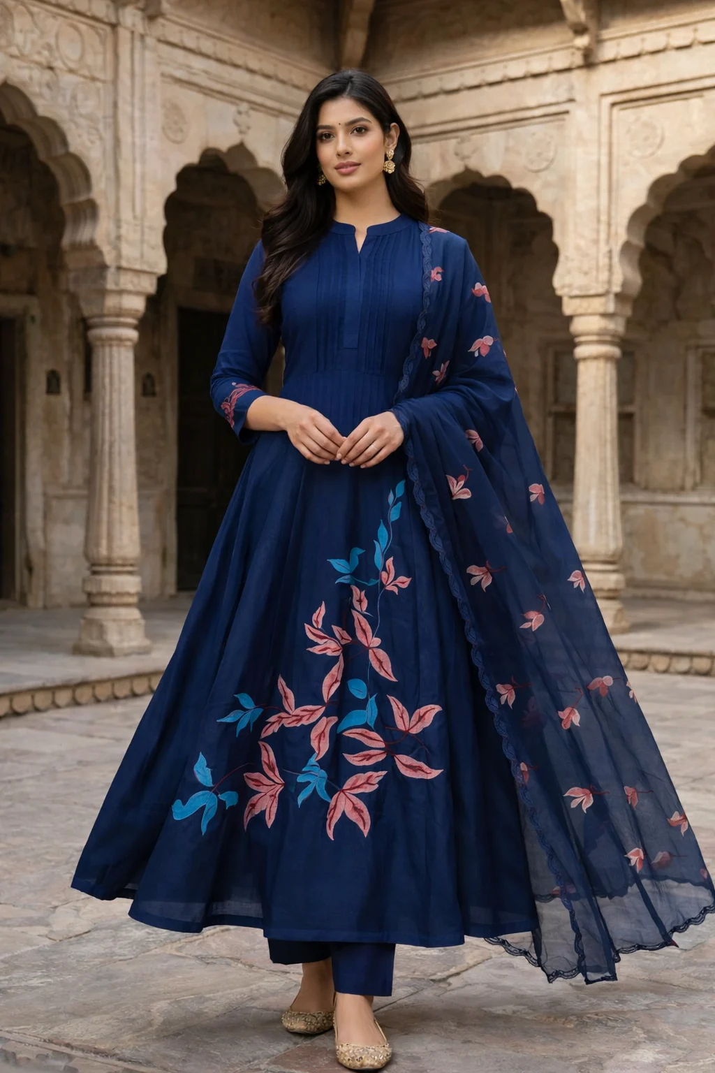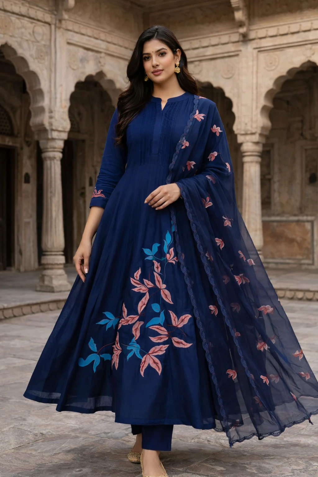 A graceful navy blue long kurti set designed with beautiful floral embroidery on the lower panel and sleeves. Paired with matching pants and a lightweight embroidered dupatta, this outfit offers a perfect blend of traditional elegance and modern style for festive and special occasions.