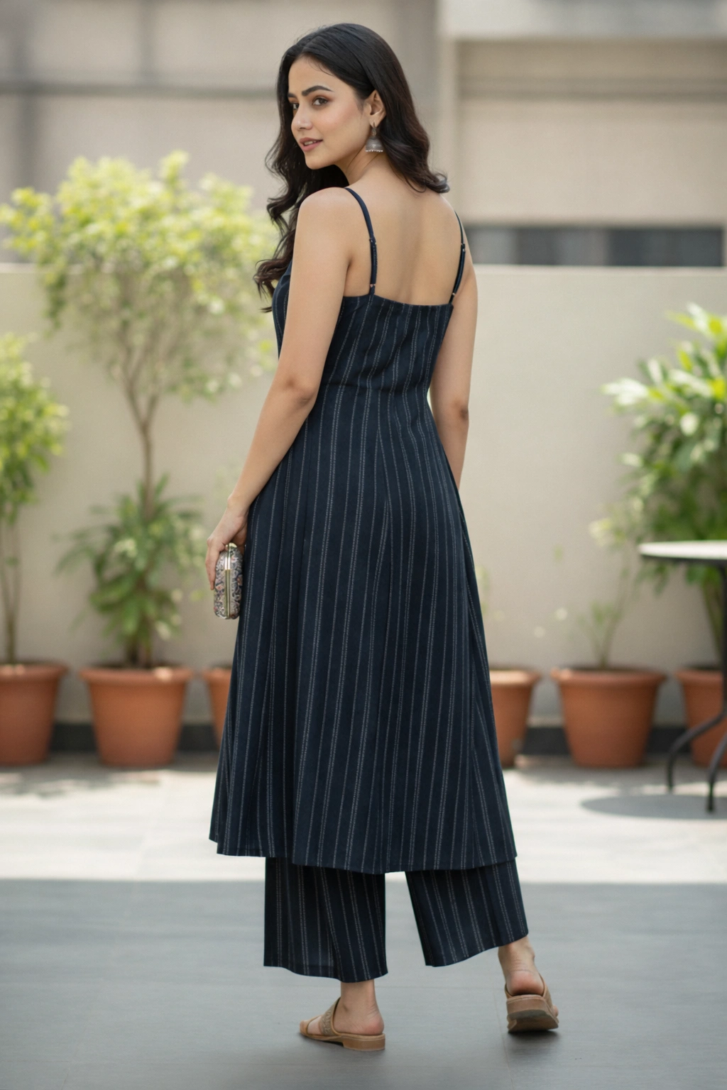 Elegant navy blue sleeveless kurti set featuring fine vertical stripes, paired with matching palazzo pants. Perfect for casual outings, festive gatherings, and summer wear with a modern ethnic look.