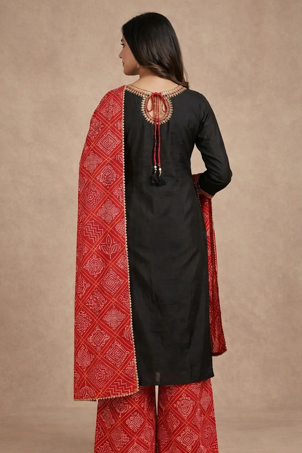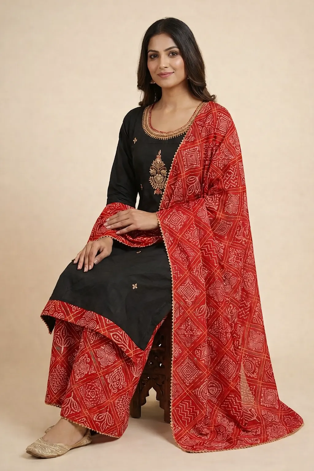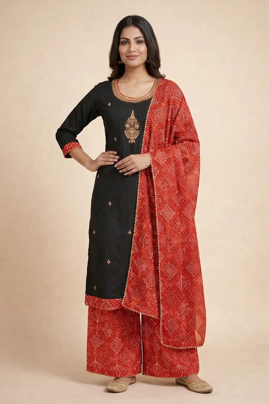 A striking black kurta set accented with delicate gold embroidery on the neckline and bodice, paired with vibrant red Bandhani-inspired printed palazzo pants and a coordinated dupatta. This ensemble beautifully blends classic elegance with traditional artistry, making it an ideal choice for festive occasions, cultural celebrations, and evening gatherings.