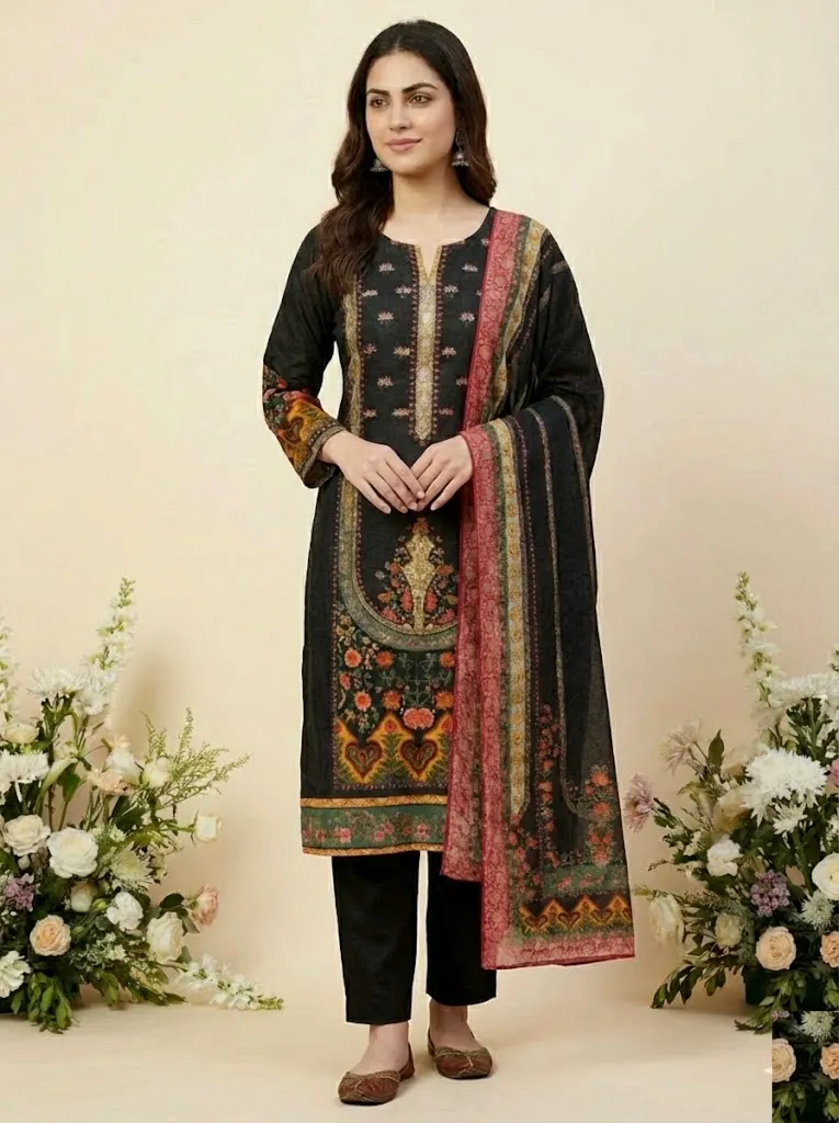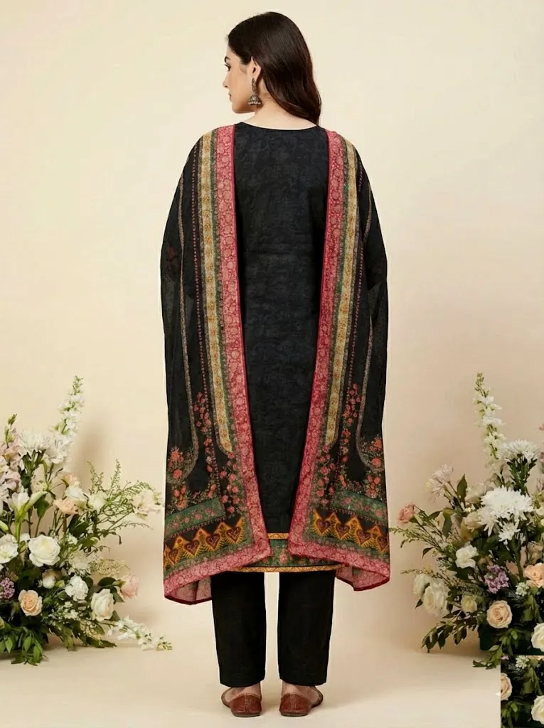 An elegant black ethnic suit adorned with intricate multicolor floral embroidery and traditional border detailing. Paired with a beautifully coordinated printed dupatta and straight trousers, this ensemble blends cultural richness with refined sophistication — perfect for festive gatherings, evening wear, and formal occasions.