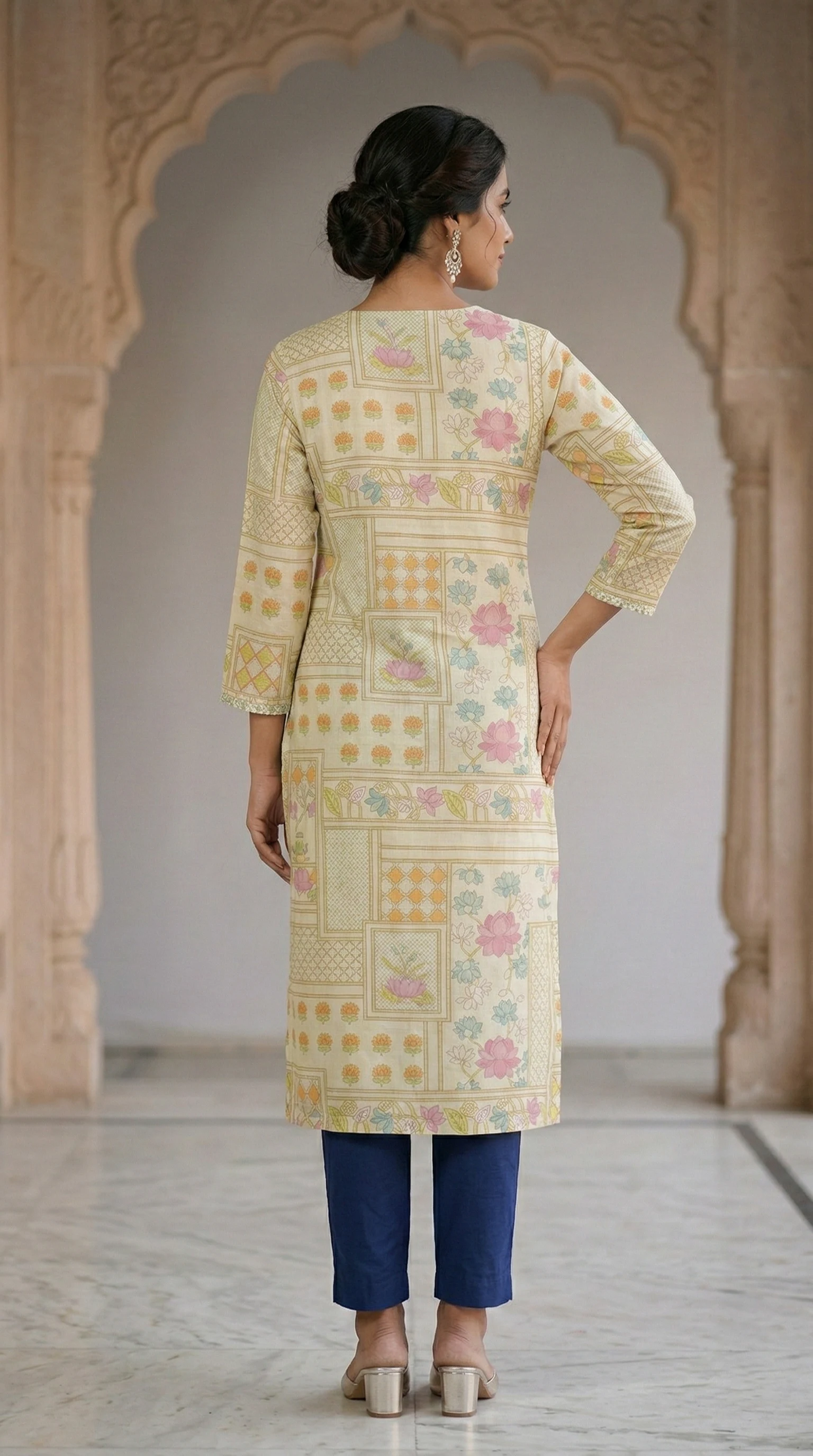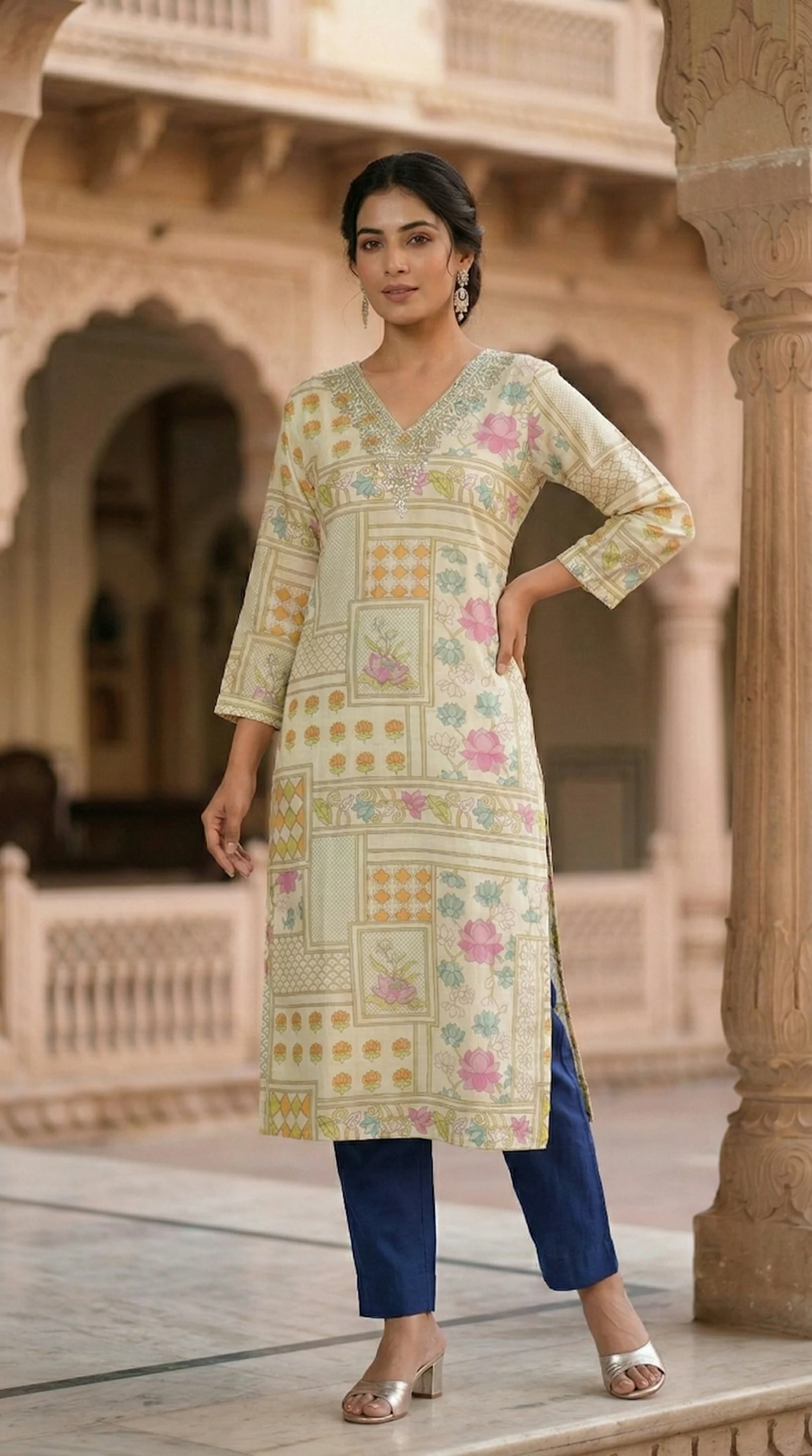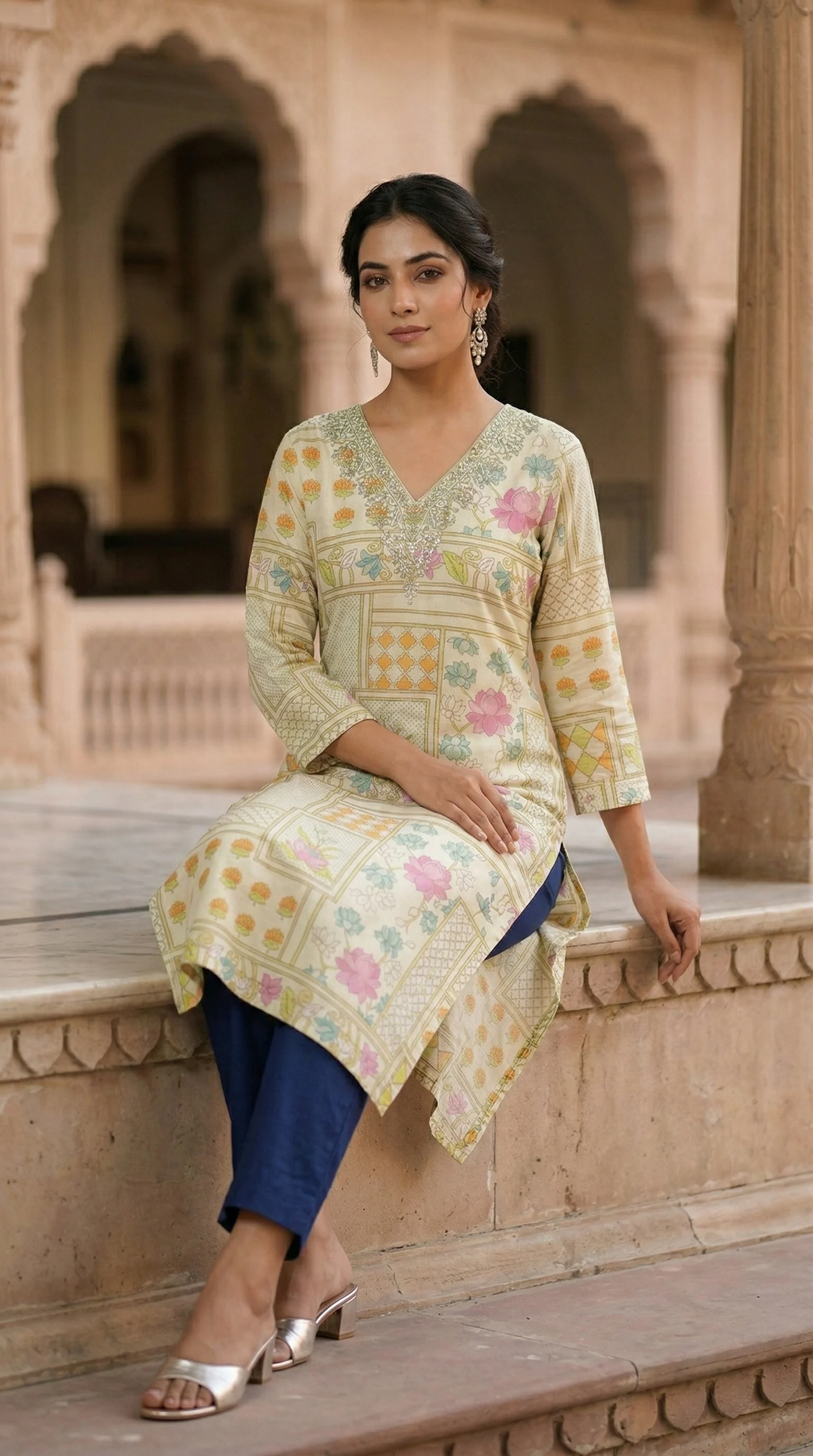 Add a touch of grace to your everyday elegance with this straight-fit kurti. Crafted in a soft off-cream, it features a unique blend of geometric frames and vibrant floral motifs. The V-neckline is beautifully highlighted with intricate silver threadwork and sequins, making it perfect for both festive gatherings and sophisticated office wear.