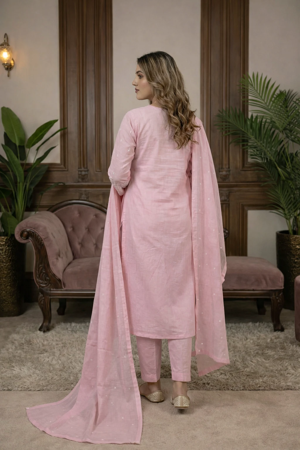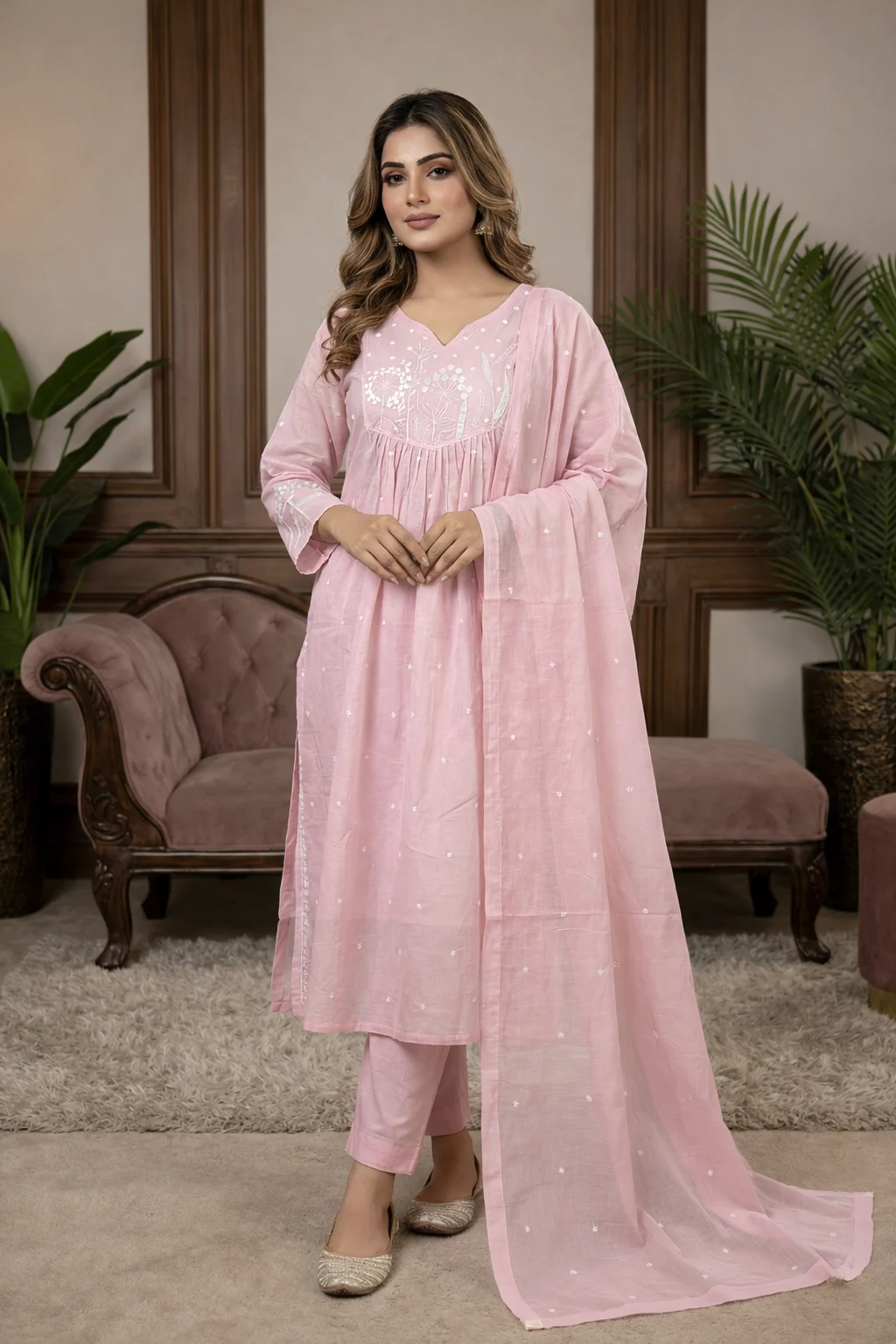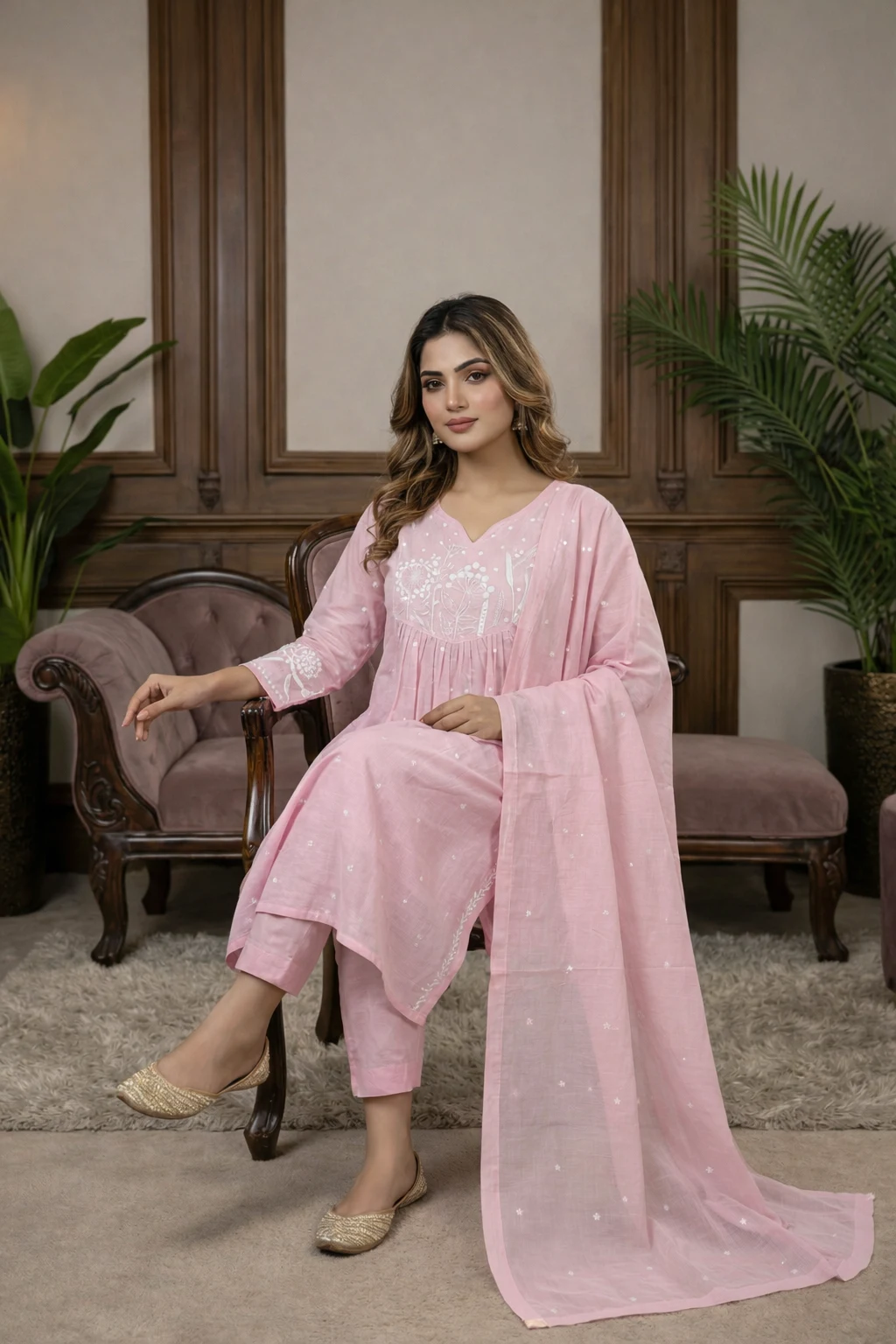 Elegant pastel pink kurta set featuring delicate white embroidery and a matching lightweight dupatta, perfect for festive and casual wear.