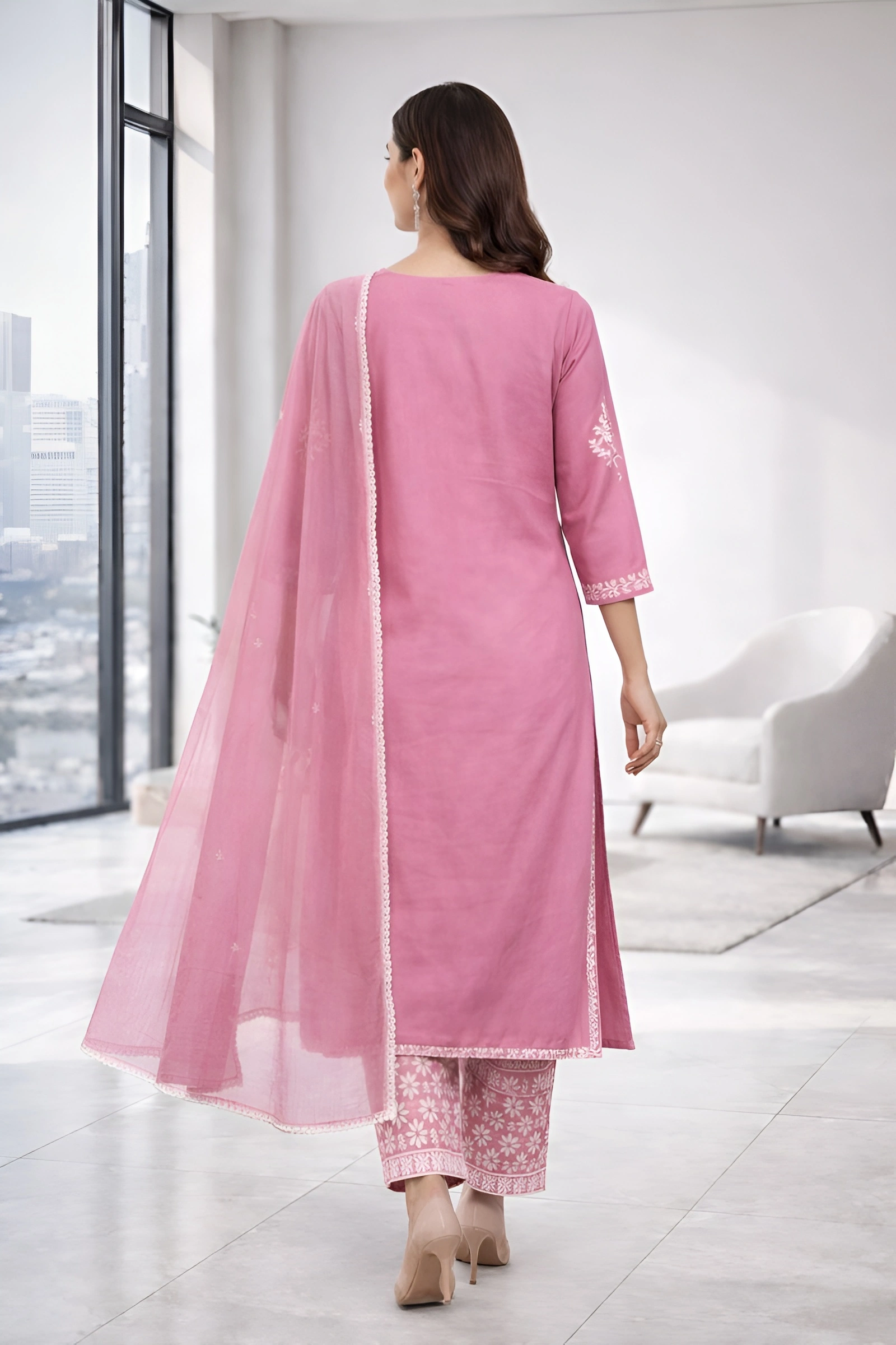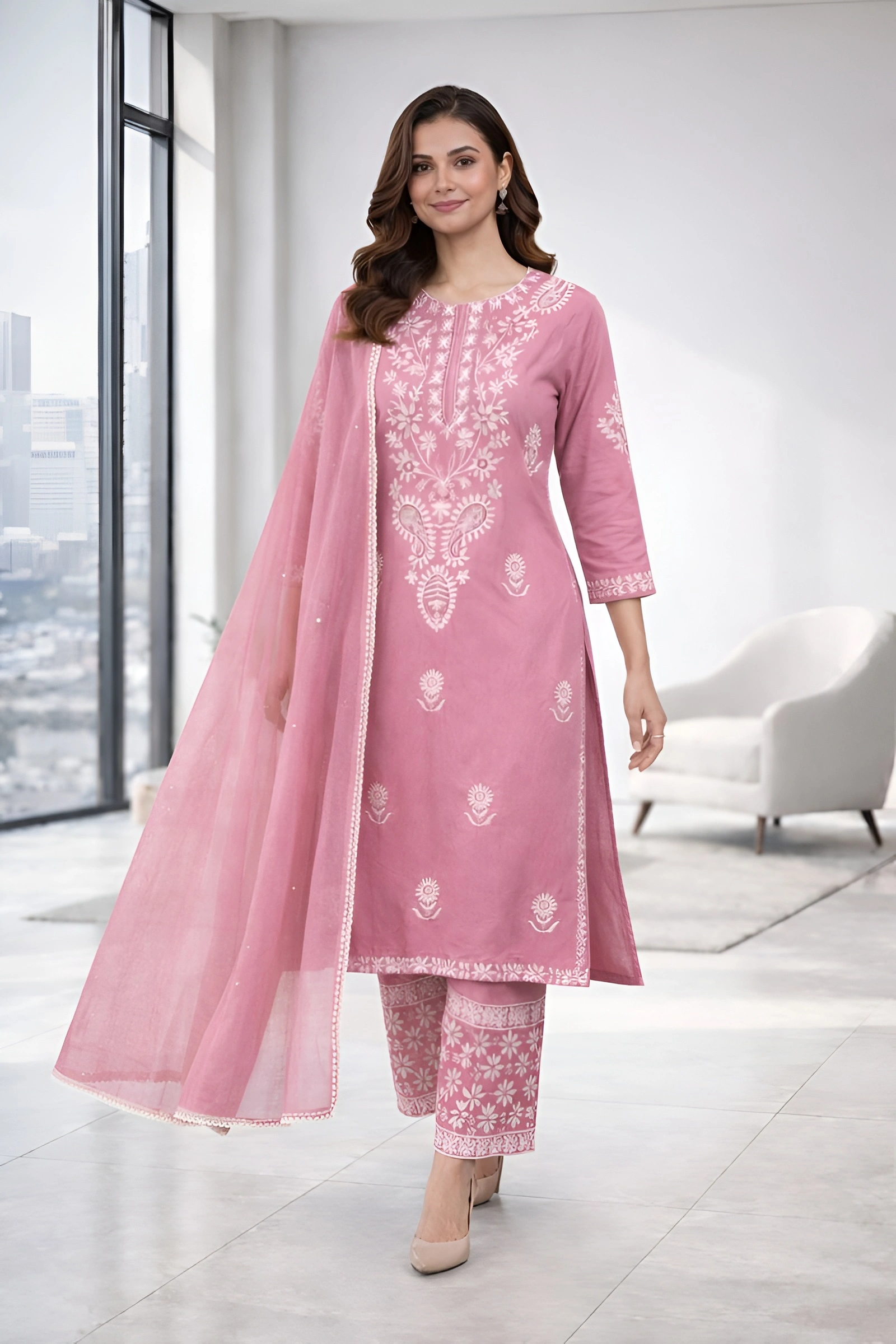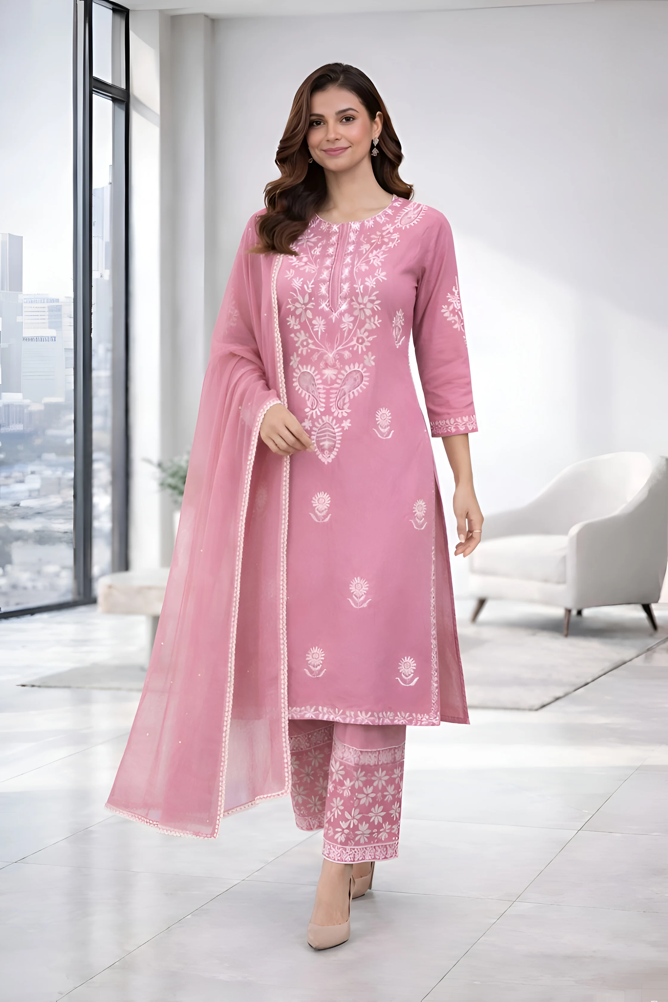 Elegant pastel pink kurta set featuring delicate white floral embroidery, paired with printed straight pants and a soft organza dupatta — perfect for festive and daytime occasions.