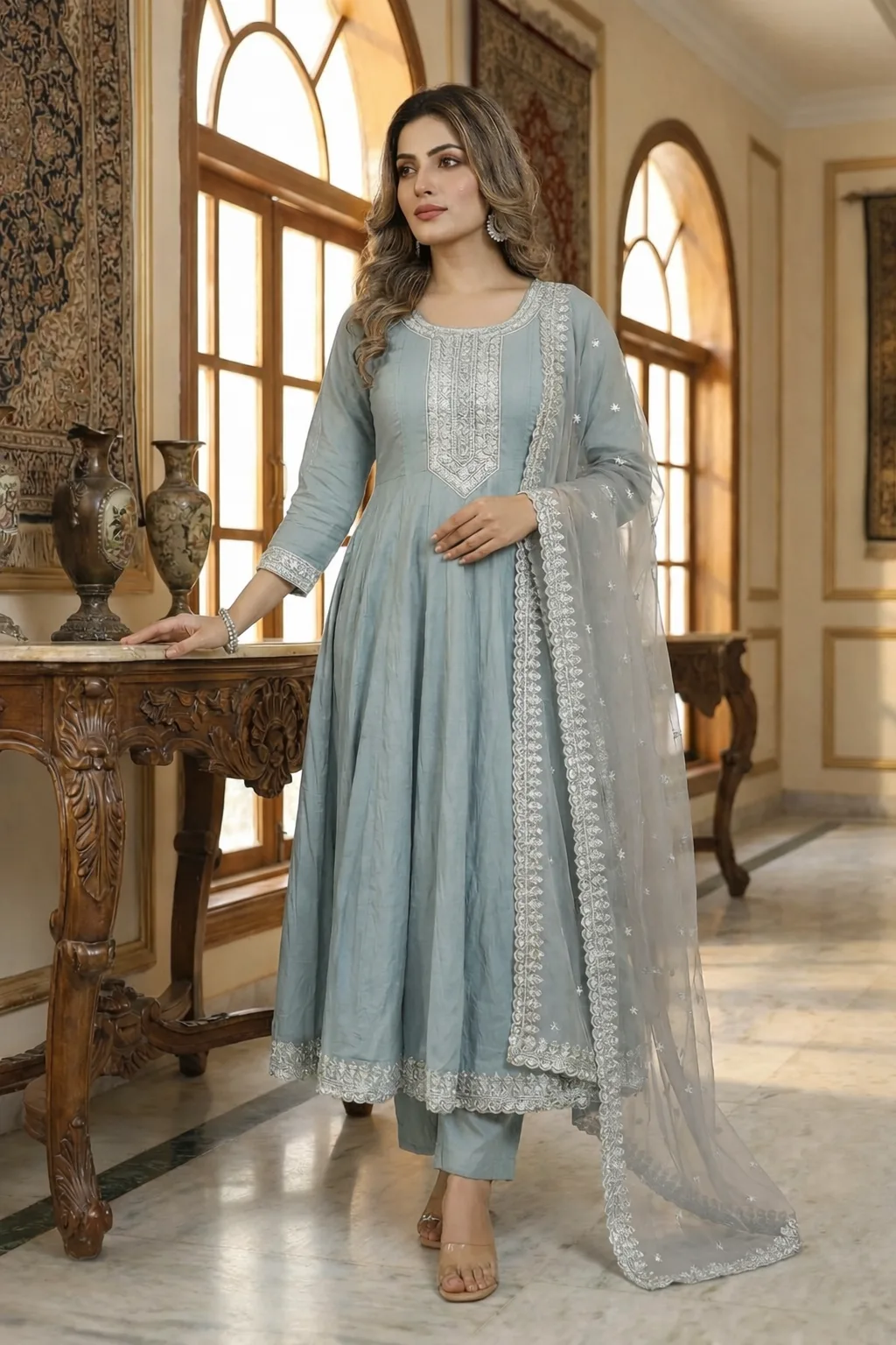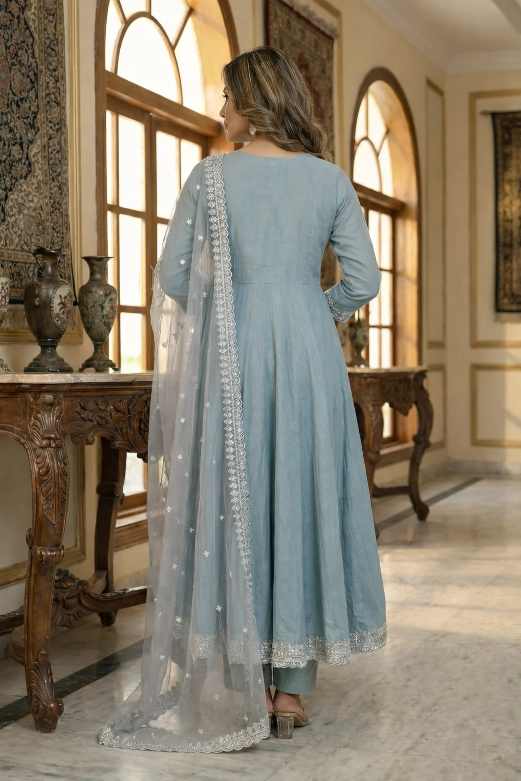 Elegant pastel sky blue Anarkali kurti set crafted with delicate white embroidery on the yoke and borders. Paired with matching straight pants and a soft net dupatta, this outfit is perfect for festive occasions, day weddings, and elegant ethnic wear styling.