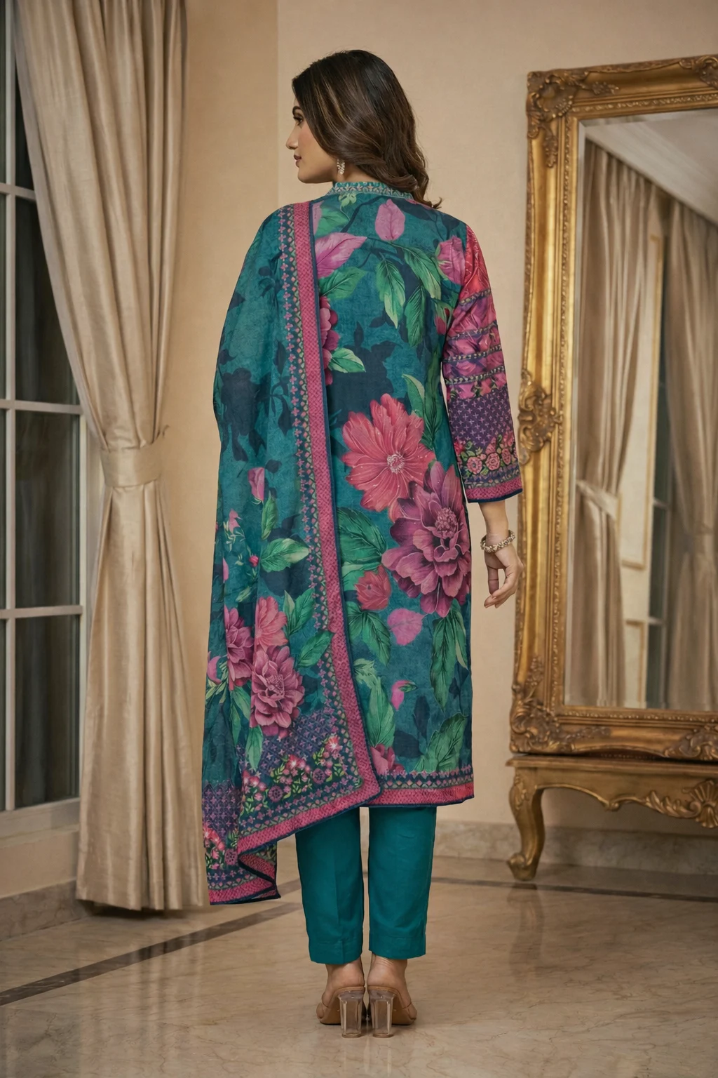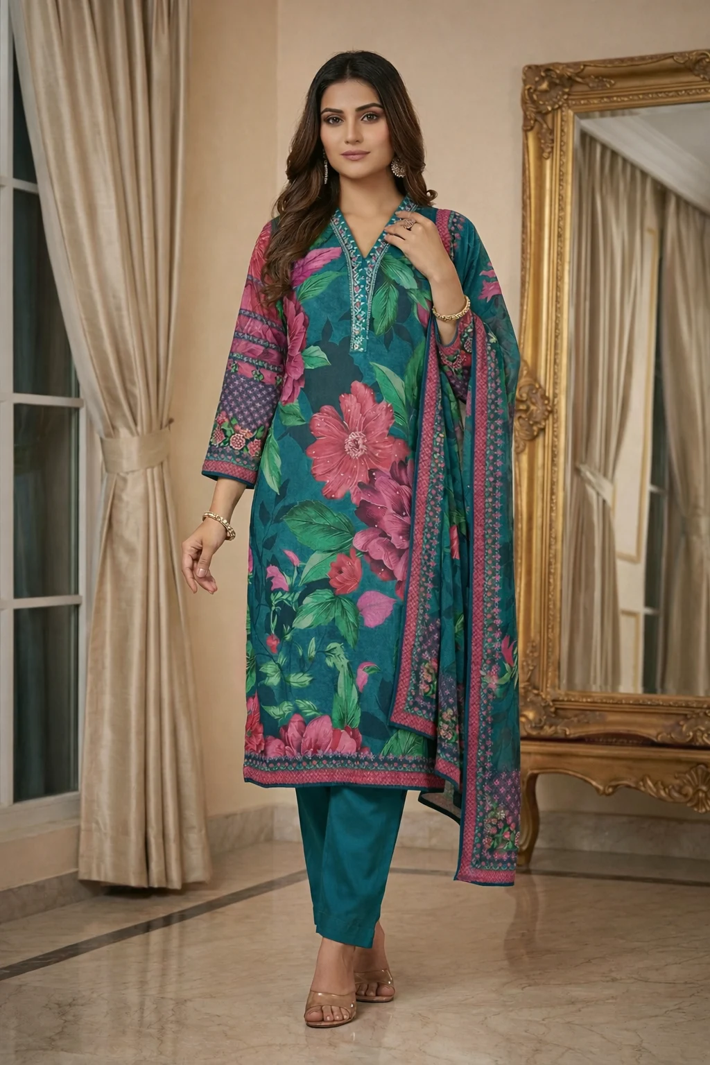 Premium teal green floral printed kurta set with matching straight pants and elegant bordered dupatta, perfect for festive and party wear.