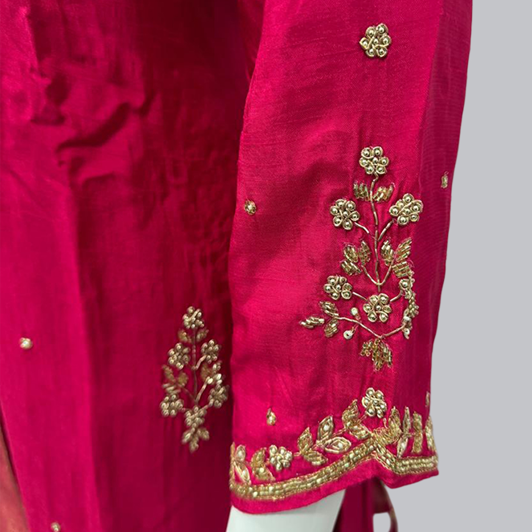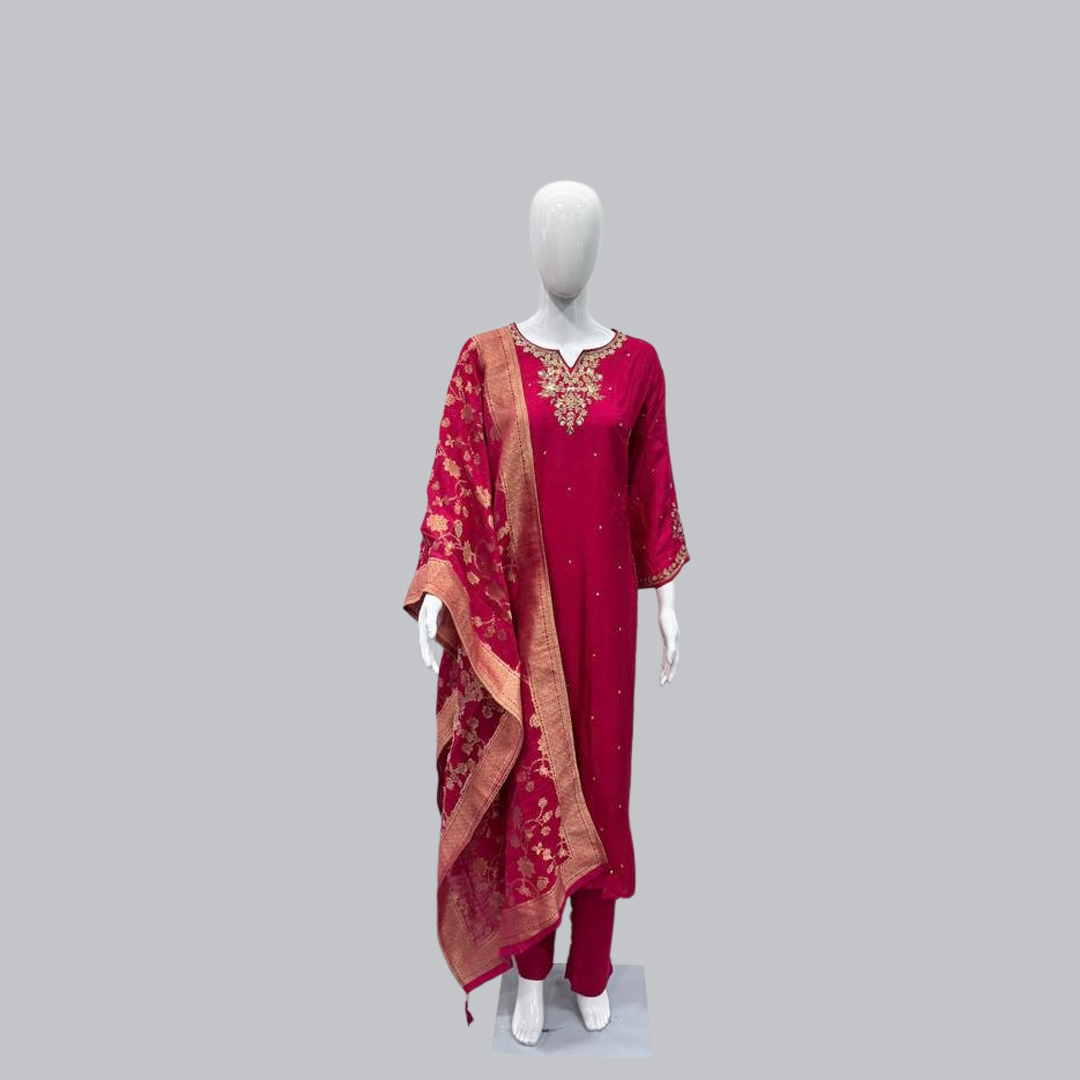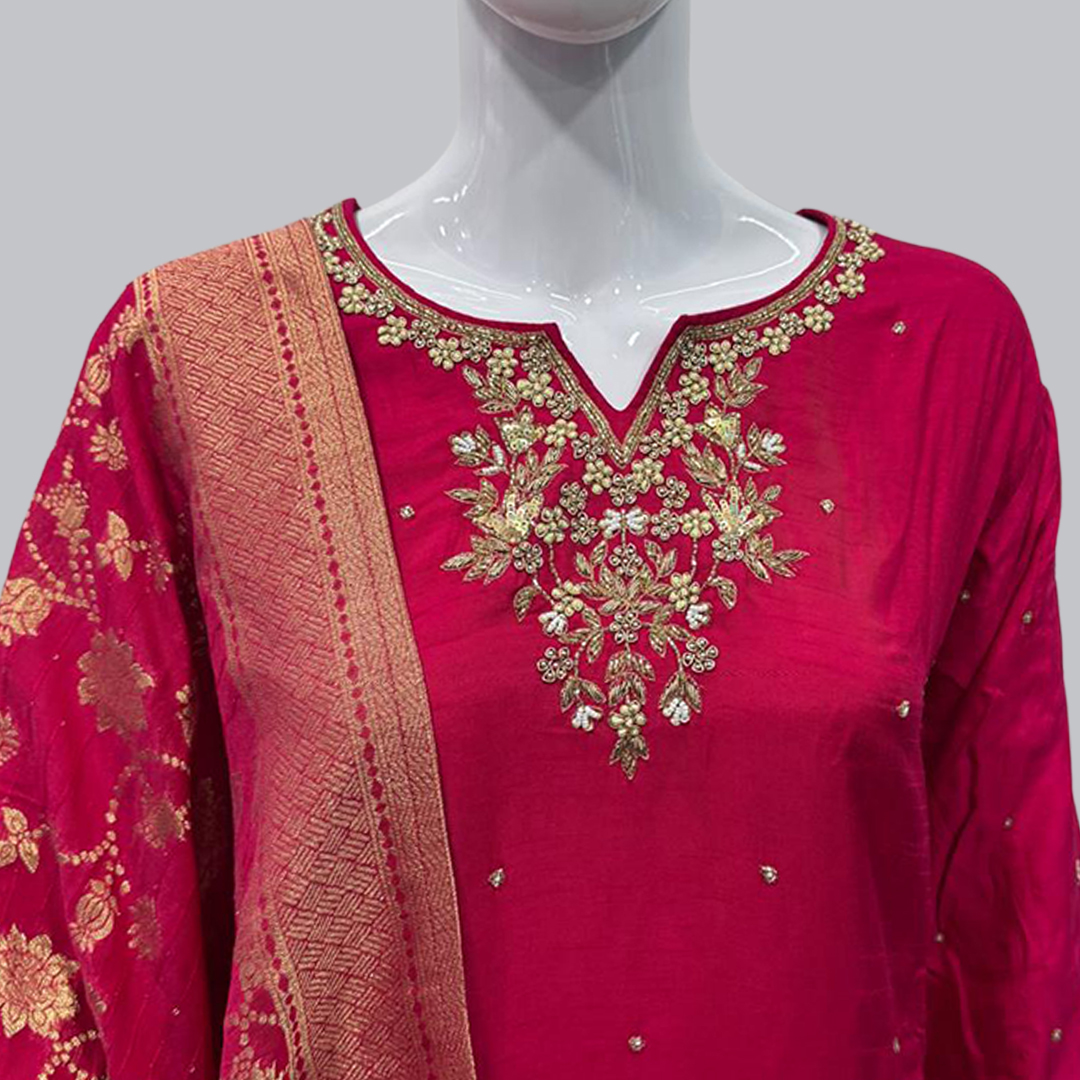 Enhance your ethnic charm with this Rani Pink Embroidered Kurti Set from Gulorian. Crafted in a luxurious fabric, this set features subtle golden embroidery on the neckline and sleeves, giving it a royal and sophisticated touch. The ensemble includes matching pants and a gorgeous Banarasi-style dupatta with rich zari detailing, ideal for festive gatherings, weddings, and special celebrations. A perfect balance of elegance and comfort for every occasion.