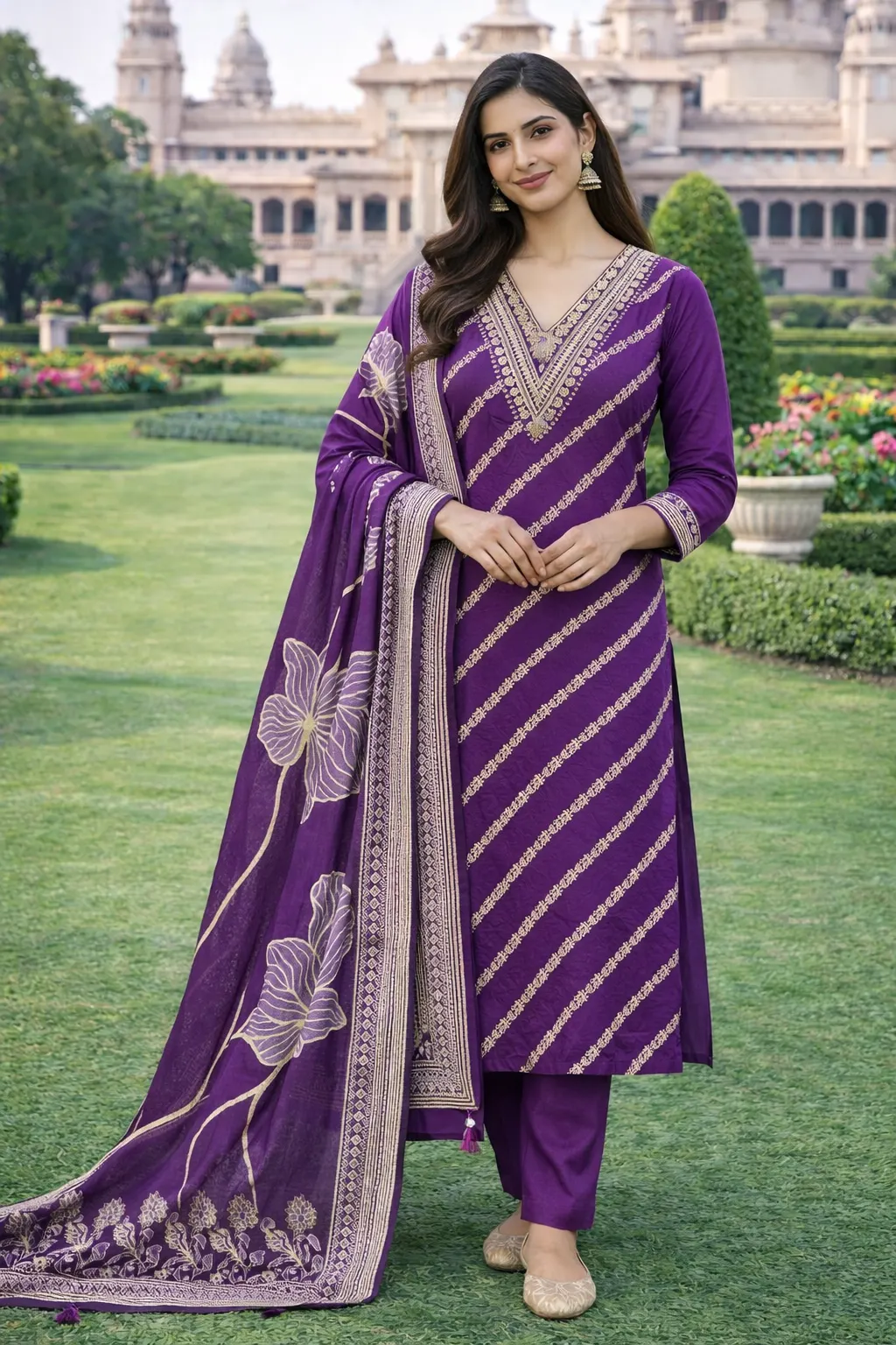 Elegant royal purple kurti set featuring intricate golden embroidery with a matching dupatta and straight pants, perfect for festive occasions and traditional gatherings.