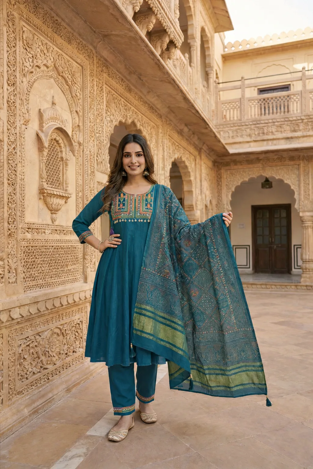 Elegant royal teal anarkali featuring intricate multicolor embroidery, straight-fit pants, and a coordinated printed dupatta for graceful ethnic styling.