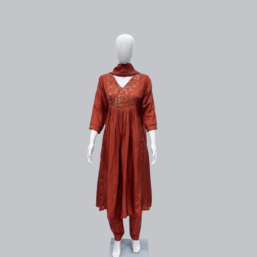 Elegant rust brown anarkali kurti set featuring delicate floral embroidery on the yoke, paired with matching pants and dupatta — perfect for festive and semi-formal occasions.